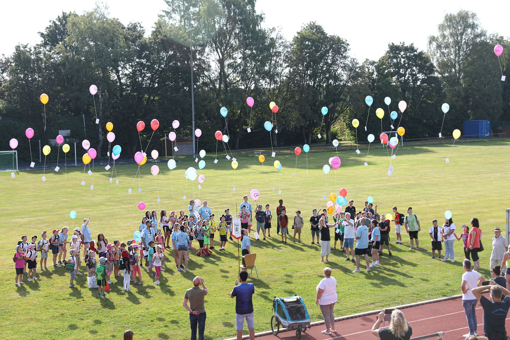 Zum Start versammelten sich die Gruppen auf dem Sportplatz vor der Eugen-Hohly-Halle. Nach der Einteilung durften alle gemeinsam einen Luftballon steigen lassen. Vergangenes Jahr zog es diese Richtung Osten. Sieben Stück landeten schließlich im Fränkischen am Brombachsee.