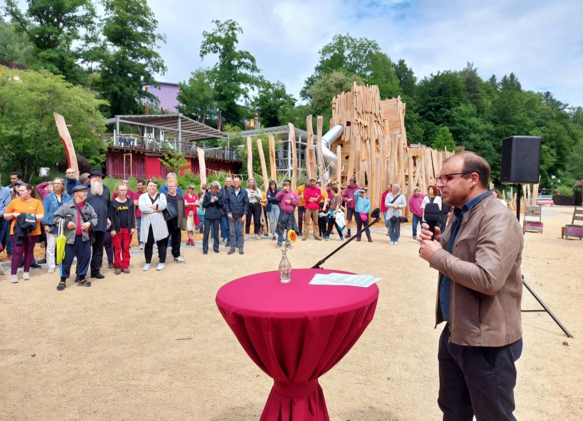 Welzheim. „Hallo, schön dass du da bist! Wenn du willst, kannst du nachher mit uns spielen.“ So begrüßten Erlebnispädagogin Louise und etliche ihrer Kolleginnen und Kollegen vom „Eins + Alles – Erfahrungsfeld der Sinne“ bei der Welzheimer Laufenmühle rund 200 Gäste und überreichten jedem eine Murmel als Symbol für die runde Sache und das Spiel. Zusammen feierten sie am Freitagnachmittag das Einweihungsfest der neuen Anlage und Spielburg „UrSprung“, einer Stätte, wie Philipp