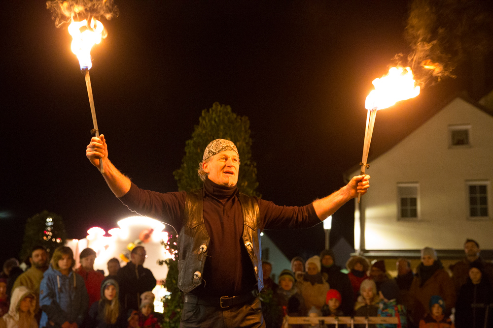 „Vor acht Jahren wurde mit neun Ständen angefangen. Jetzt sind es rund 50“, beschrieb Bürgermeister Michael Segan begeistert die Entwicklung. Drehte sich um und ging zu St. Martin, alias Oscar Köngeter, der mit Pferd Clara die vielen Kinder beim Laternenumzug begleitete. Der Umzug verzögerte sich allerdings, denn der Feuerkünstler auf dem Platz vor dem alten Rathaus hatte die Gäste so in seinem Bann, dass er die Uhrzeit vergaß. Aber schließlich konnte sich der kleine Laternenumzug doch noch in Bewegung setzen in Richtung Alte Halle. Bürgermeister Segan selbst teilte sich mit St. Martin den Mantel. Und für die Kinder gab’s zum Abschluss die beliebten Martiniwecken.