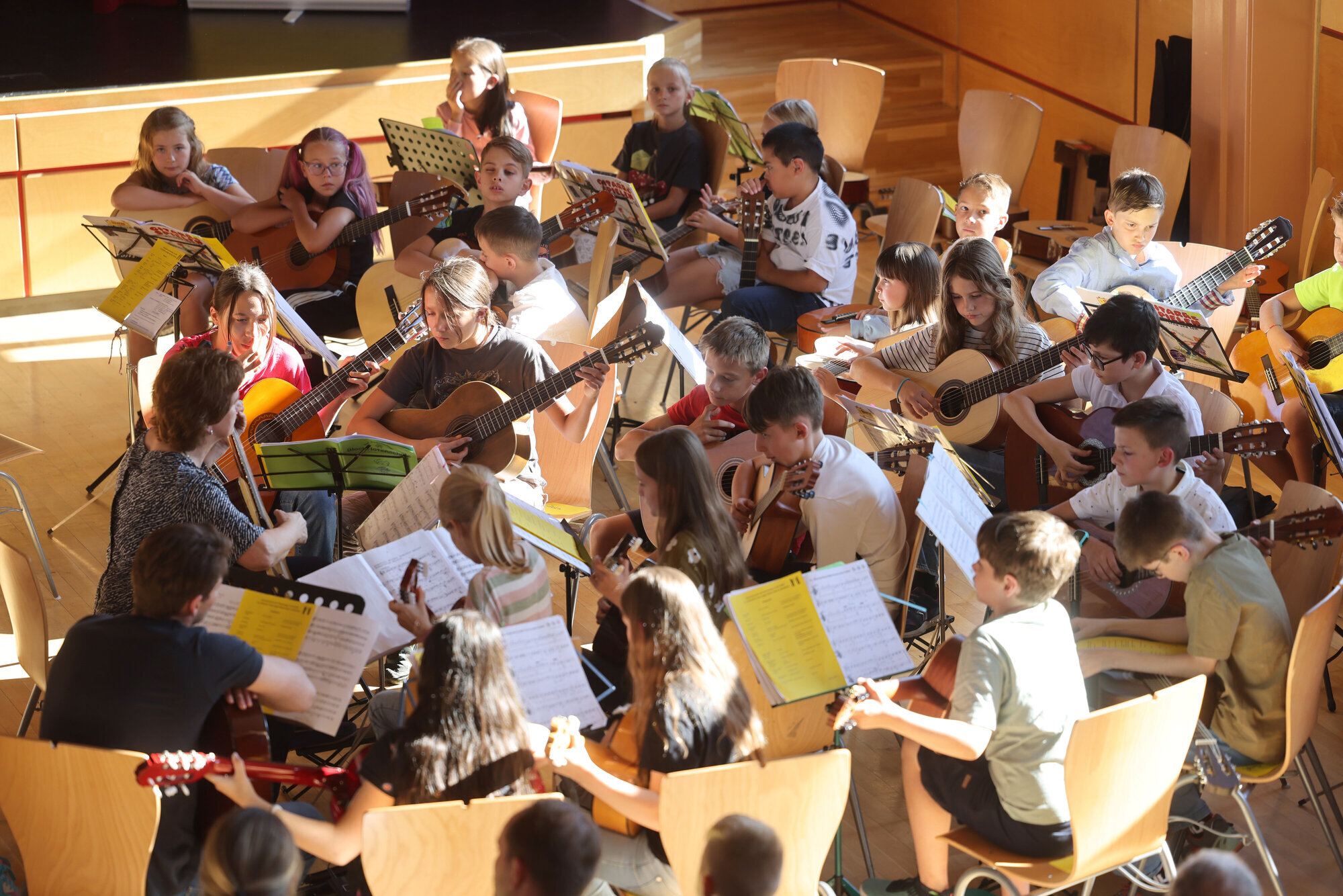 Welzheim. Um kurz vor 18 Uhr herrscht am Donnerstag (17.07.) in der Eugen-Hohly-Halle ein aufgeregtes Klangchaos aus Kinderstimmen, Gitarrenakkorden, Blockflötengepiepse und der letzten Generalprobe einer Polonaise für Klavier und Geige. Währenddessen nimmt das (zahlreich erschienene) Publikum aus Familien, Lehrern und freundlichen Unterstützern der Jugendmusikschule schon mal Platz und begrüßt sich gegenseitig. Kein Wunder, dass die kleinen und größeren Musiker aufgeregt