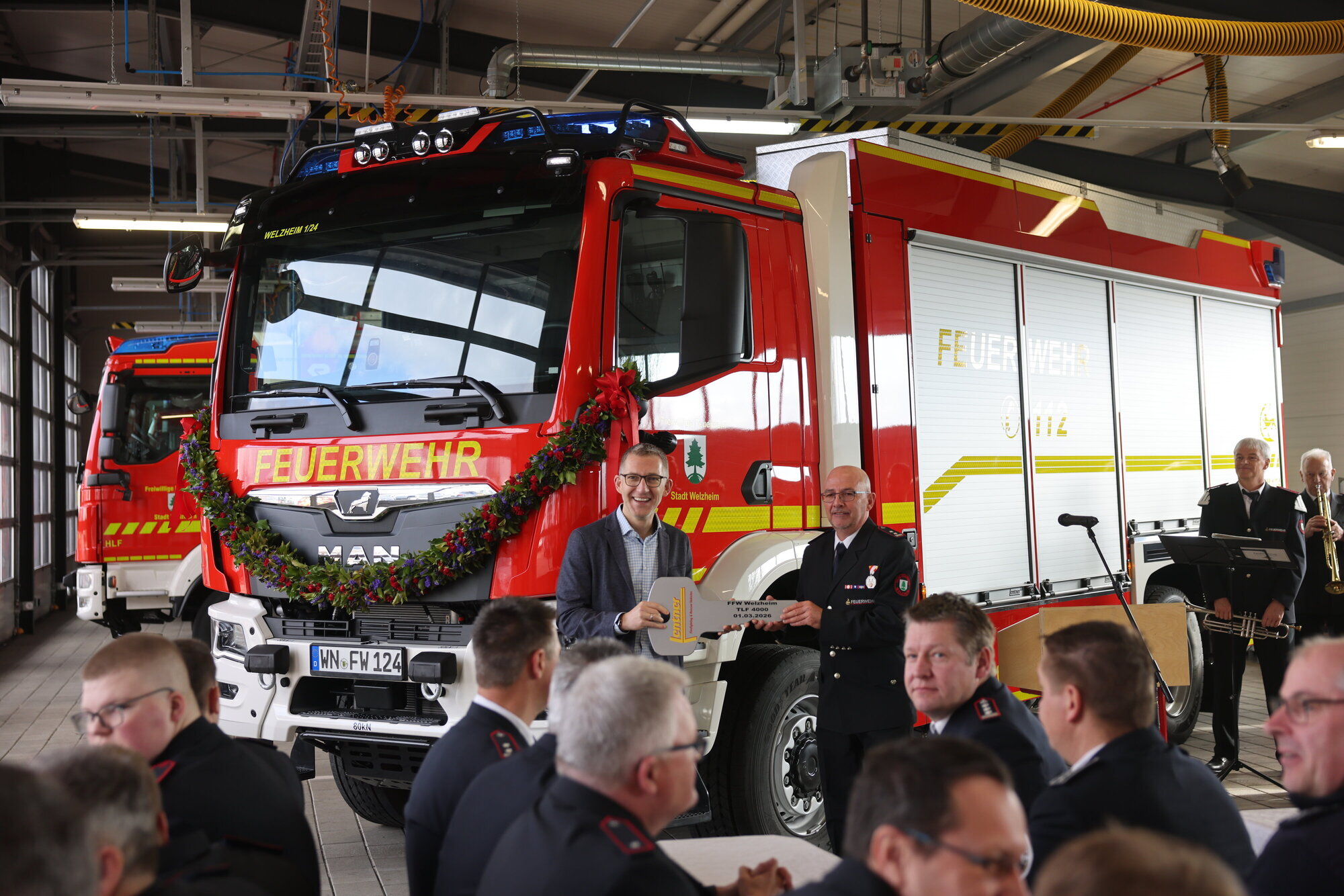 Welzheim. Mehr als fünf Jahre hat es von der Erstellung des Feuerwehrbedarfsplans 2020 bis zur Auslieferung des Tanklöschfahrzeuges TLF 4000 gedauert. Nun wurde es am vergangenen Sonntag in der Halle der Freiwilligen Feuerwehr in Welzheim präsentiert. Extra lang, weil der Wassertank nicht nur 4000, sondern 5500 Liter fasst und weil zusätzlich noch ein 500-Liter-Tank für Löschschaum eingebaut wurde… und so hoch, dass es fast die Decke berührt.