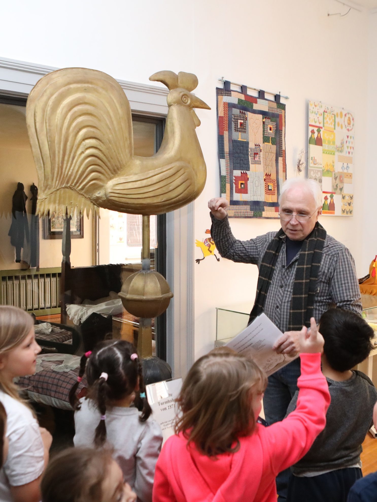 Daneben sollen weitere Lebewesen, die sich unter dem Begriff Huhn, Hahn oder Henne tummeln, betrachtet werden. Das Huhn wird auch als Fleisch- und Eierlieferant beleuchtet. Und am Ende steht dann aber die Frage, ob es wirklich so erstrebenswert ist, ein Huhn zu sein, wenn man am Ende im Suppentopf landet. – Zur Ausstellung gibt es ein umfangreiches Rahmenprogramm: Ausmalbögen für Kinder liegen aus. An manchen Öffnungstagen gibt es Bastel- und Vorleseangebote. Mitglieder des Kleintierzüchtervereins werden Hühner ausstellen und an den Osterfeiertagen sollen Küken im Brutkasten schlüpfen. Ebenfalls an den Osterfeiertagen wird die österliche Tradition des Eierhetzelns im Museumshof gepflegt, wozu die Besucher zum Mitmachen eingeladen sind.