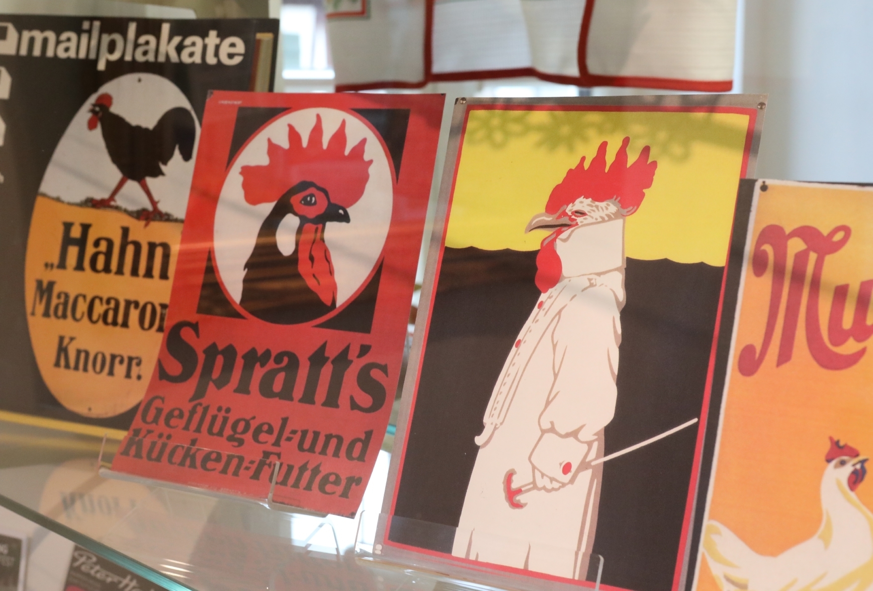 Es gibt Hühner als Kuscheltiere, Hühner aus Holz, Hühner aus Plastik, Hühner aus Schokolade und ein Huhn, das war einst mal lebendig. Es wurde für die Ausstellung präpariert und ist mindesten so groß wie der Gockel, der einst die Spitze des Kirchturms geschmückt hat.