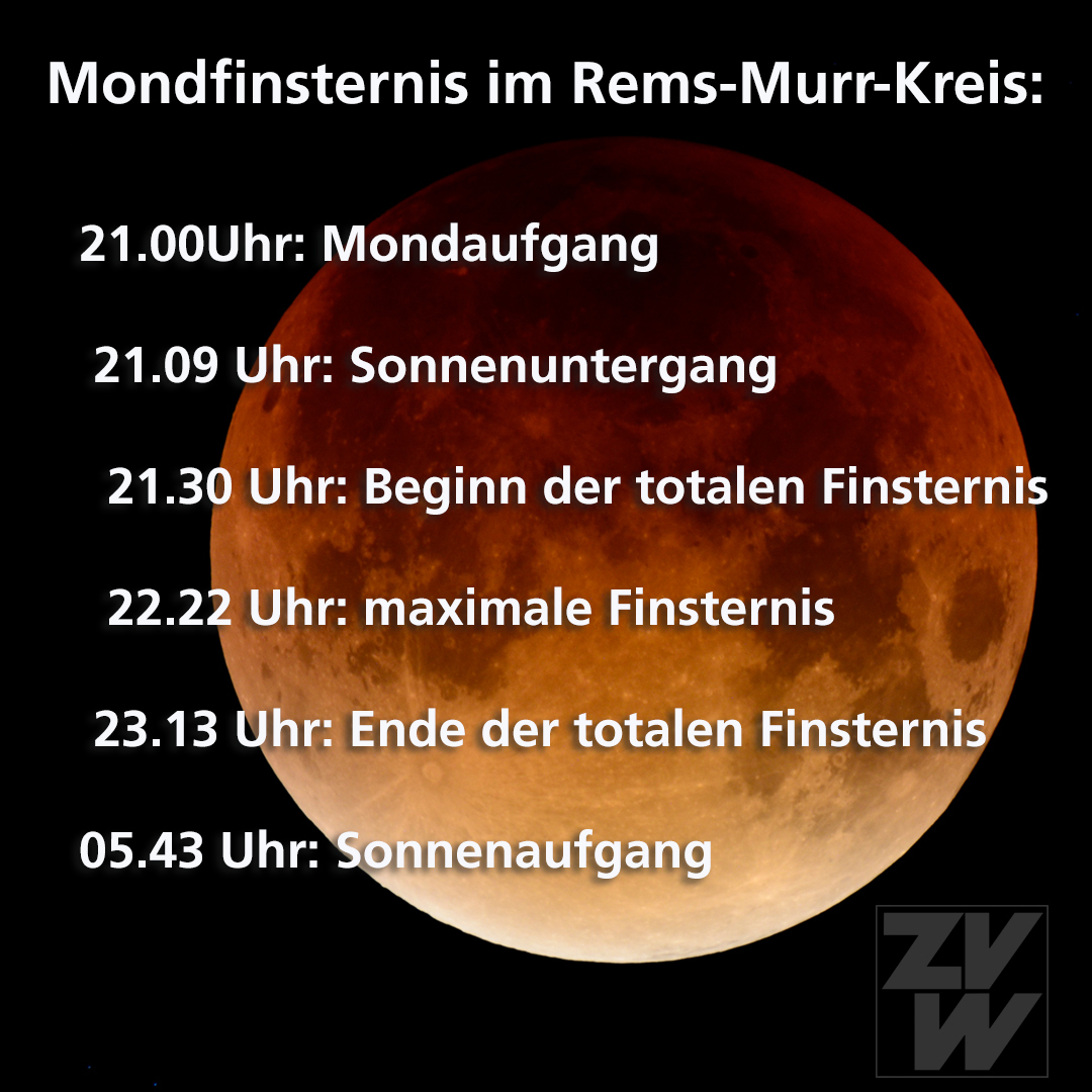 Das Schauspiel fängt mit Beginn der Dunkelheit am Abend an. In München geht der Mond um 20.48 Uhr auf, in Hamburg um 21.16 Uhr. Dann dauert es noch einige Minuten, bis der Mond komplett in den Kernschatten der Erde eingetaucht ist und die totale Mondfinsternis beginnt. Die Mitte der totalen Finsternis wird um 22.22 Uhr und das Ende um etwa 23.13 Uhr erreicht. Der Mond ist gleich merklich röter und dunkler, weshalb bei einer Mondfinsternis von Blutmond die Rede ist.