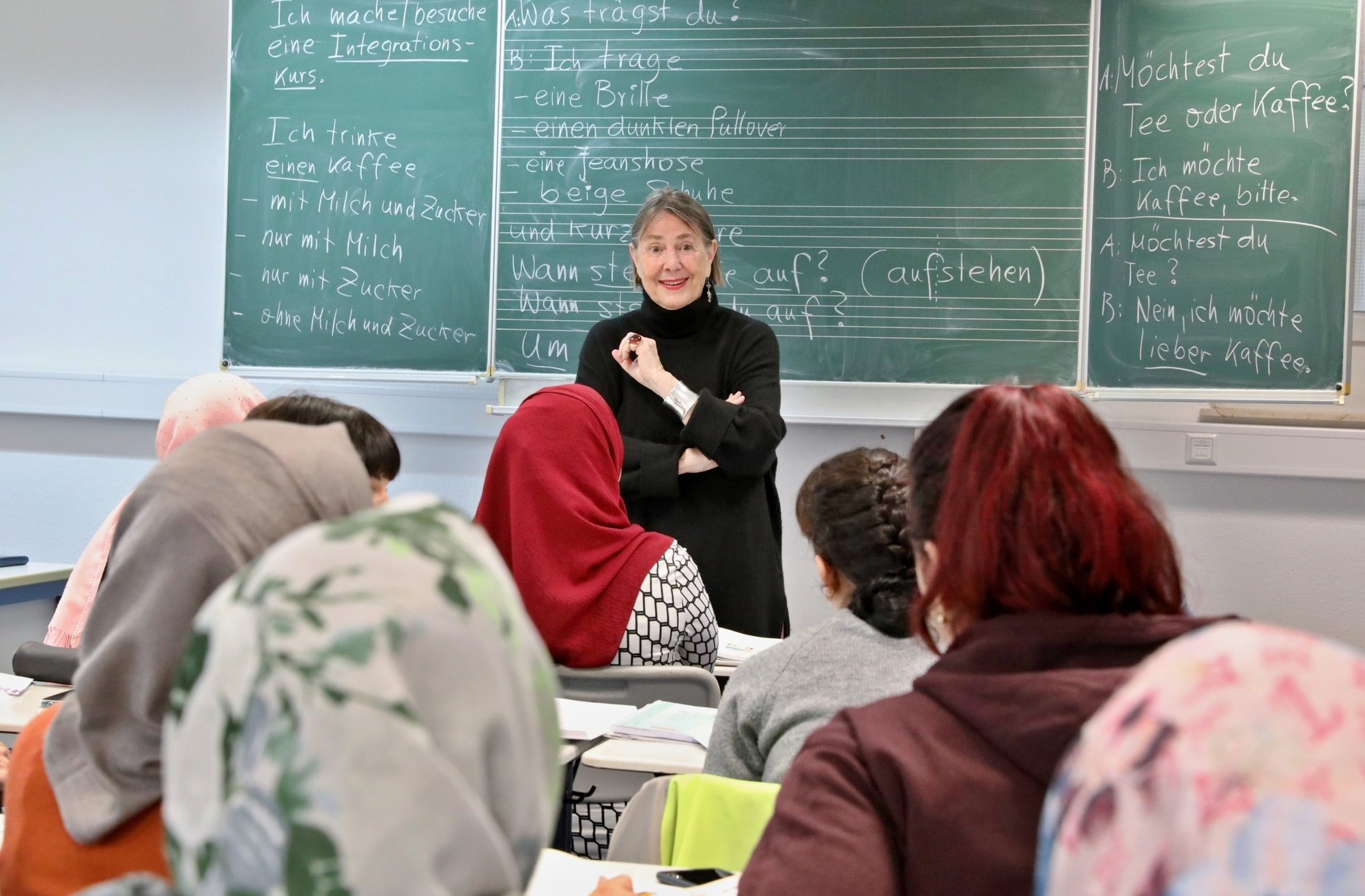 Federmäppchen und Schulbücher liegen bereit, an den Bänken hängen Rucksäcke und Taschen, Tafel und Kreide gibt es, und natürlich unterhalten sich die Schülerinnen gern mit ihren Nebensitzerinnen: So gleicht der Kurs, den Dozentin Maria-Theresia Rodriguez-Silvero leitet, einer Schulklasse. Nur, dass die Schülerinnen und der Schüler das Jugendalter überschritten haben, ja, bereits ein ganzes Leben an Erfahrungen mitbringen. Und in dem Kurs geht es auch nicht um Mathe oder Physik, sondern um