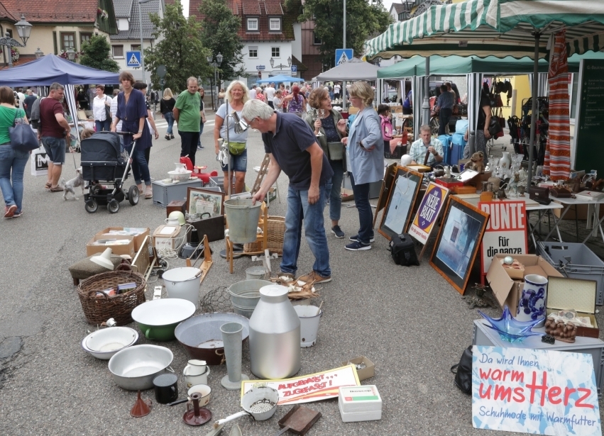 Mit 160 Ständen gehörte der Flohmarkt, der die komplette Innenstadt beansprucht hat, wohl zu den größten in der Region. Am Freitagnachmittag wurde, gerade noch rechtzeitig zum Festbeginn, der Grobbelag auf der Wilhelmstraße fertig asphaltiert. Das flohmarkttypische Angebot reichte klassischerweise von „was die Welt nicht braucht“, wie beispielsweise „Das Blondinen Kochbuch“, bis zum Hingucker mit erhöhter Pulsschlaggarantie, was etwa beim Anblick eines Lüsters aus Bleikristall oder einem Rosenthal-Porzellanfigürchen durchaus passieren konnte.