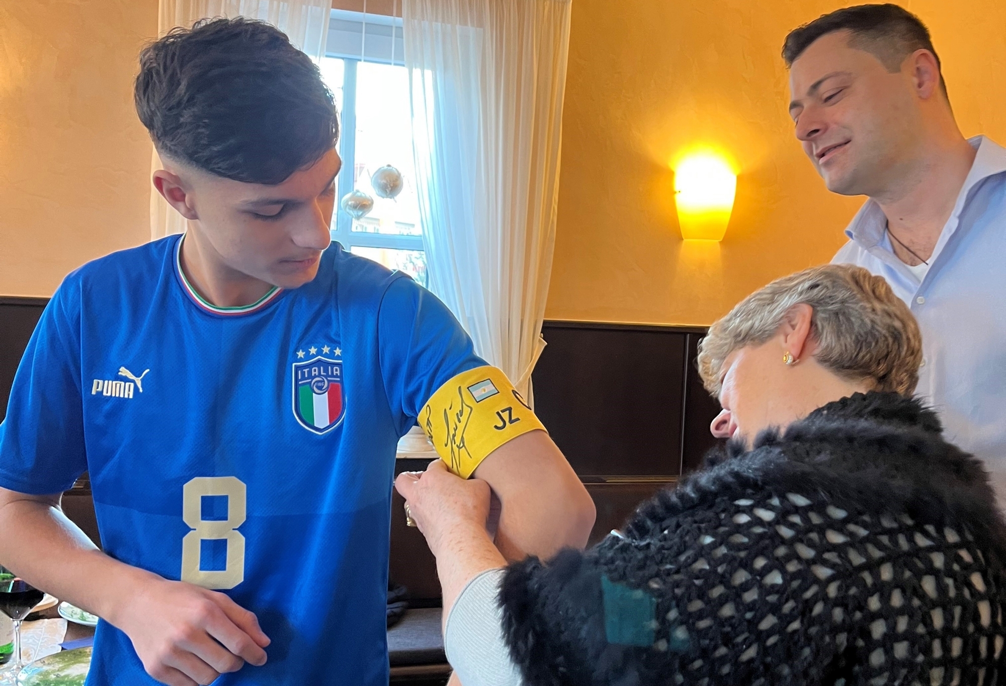 Warum freut sich ein Fan von Juventus Turin über eine Kapitänsbinde von Inter Mailand? Ganz einfach. Massimo Di Benedetto, Jungprofi in der U 15 des VfB Stuttgart, ist zwar Juve-Fan, aber wenn man bei einem Gewinnspiel in der Welzheimer Pizzeria Ionio den Hauptpreis ergattert, nämlich eine original unterschriebene Kapitänsbinde von Inter-Weltstar Javier Zanetti, ist die Freude trotz der Rivalität riesengroß. Und der Papa von Massimo, auch Juve-Anhänger, meinte: „Sollte Massimo in der Zukunft