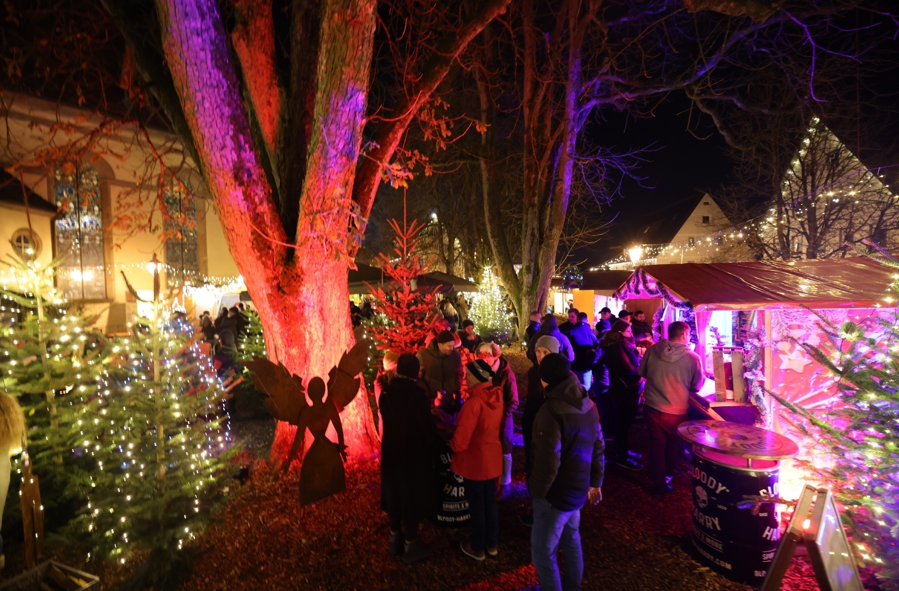 20 Uhr am Samstag neben der Gallus-Kirche in Welzheim. Lichter glitzern in den Nadelbäumen, die zahlreichen Stände sind hell erleuchtet und der Untergrund ist dicht mit Rindenmulch bedeckt. Es duftet nach Glühwein, Rostbratwürstchen, Steak und Knoblauch.