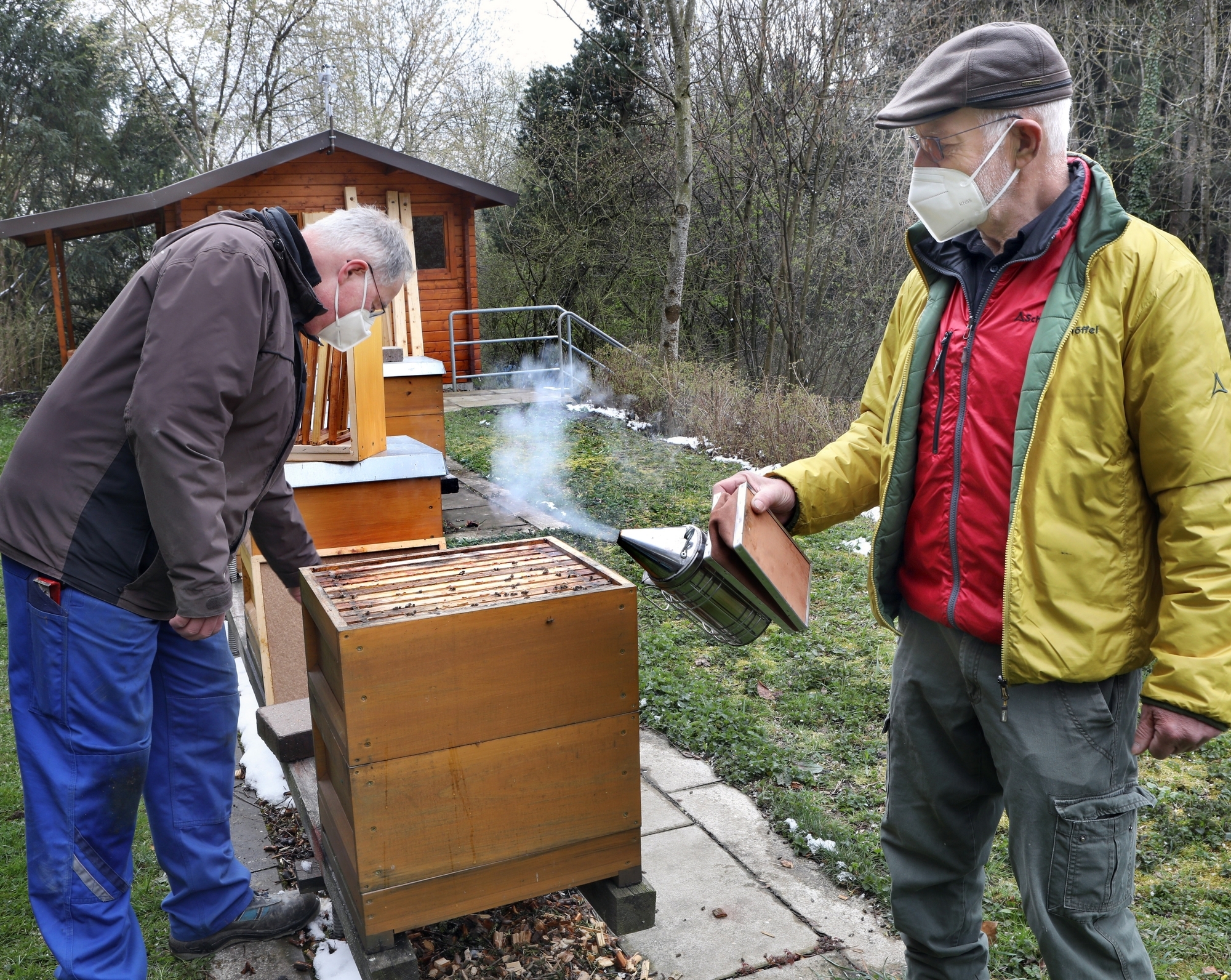Ein kurzer Ruck, Werner Kugler zieht geschickt eine Art Kasten hervor und hebt ihn an. Er hält sozusagen die Vorratskammer eines Bienenvolks in der Hand. Indem er das Gewicht des Kastens prüft, stellt er fest, ob die Bienen noch genug Futter haben. Ein bisschen Rauch für die Tiere, ein kurzer Blick auf eine Wabe: „Wunderschön“, lobt Heinrich Lindauer.