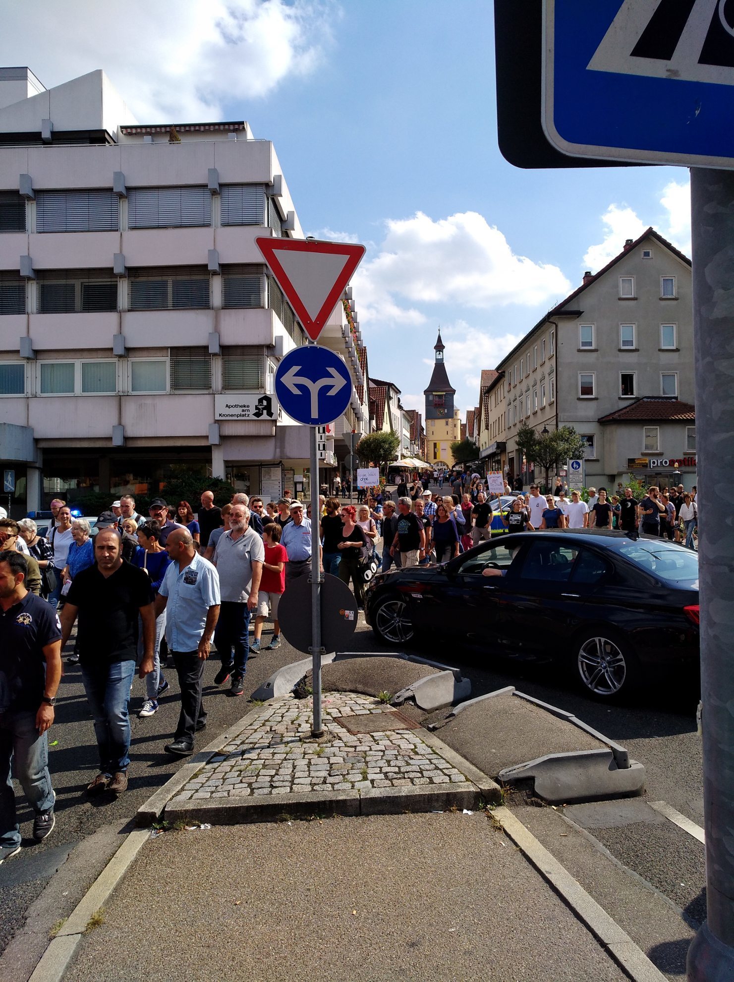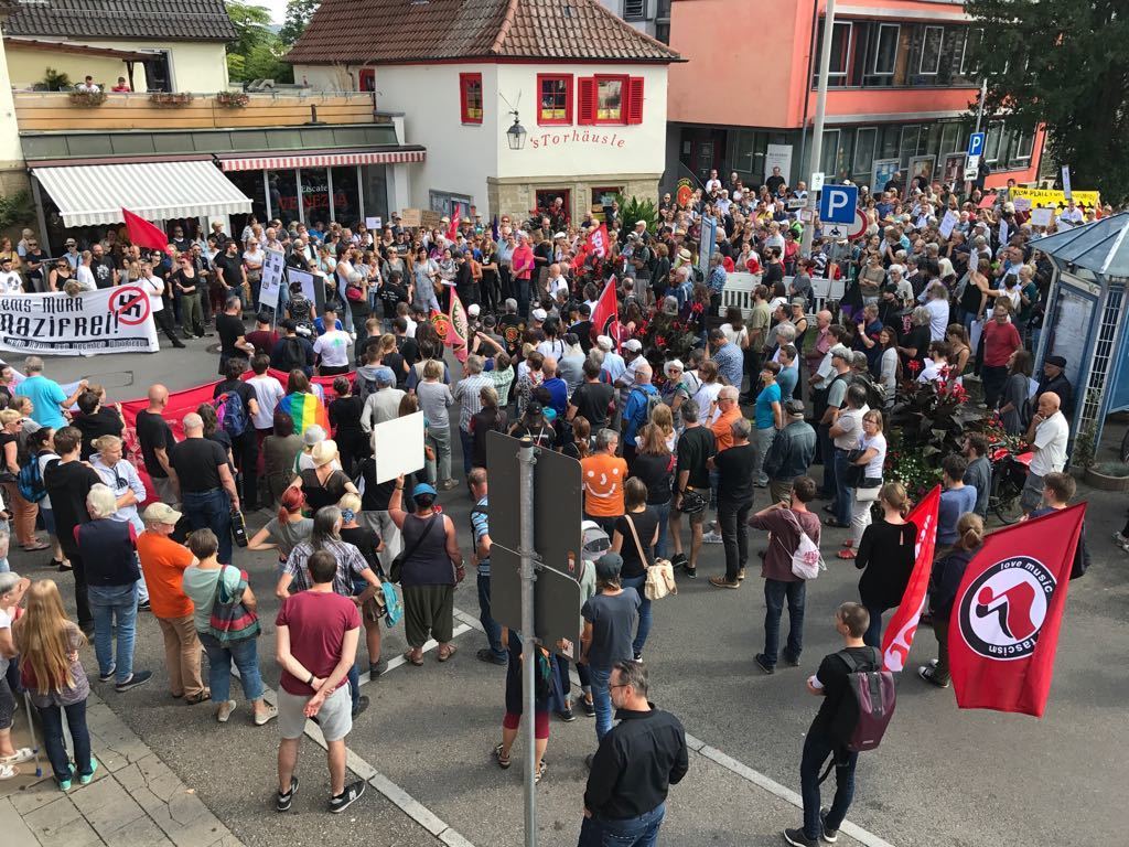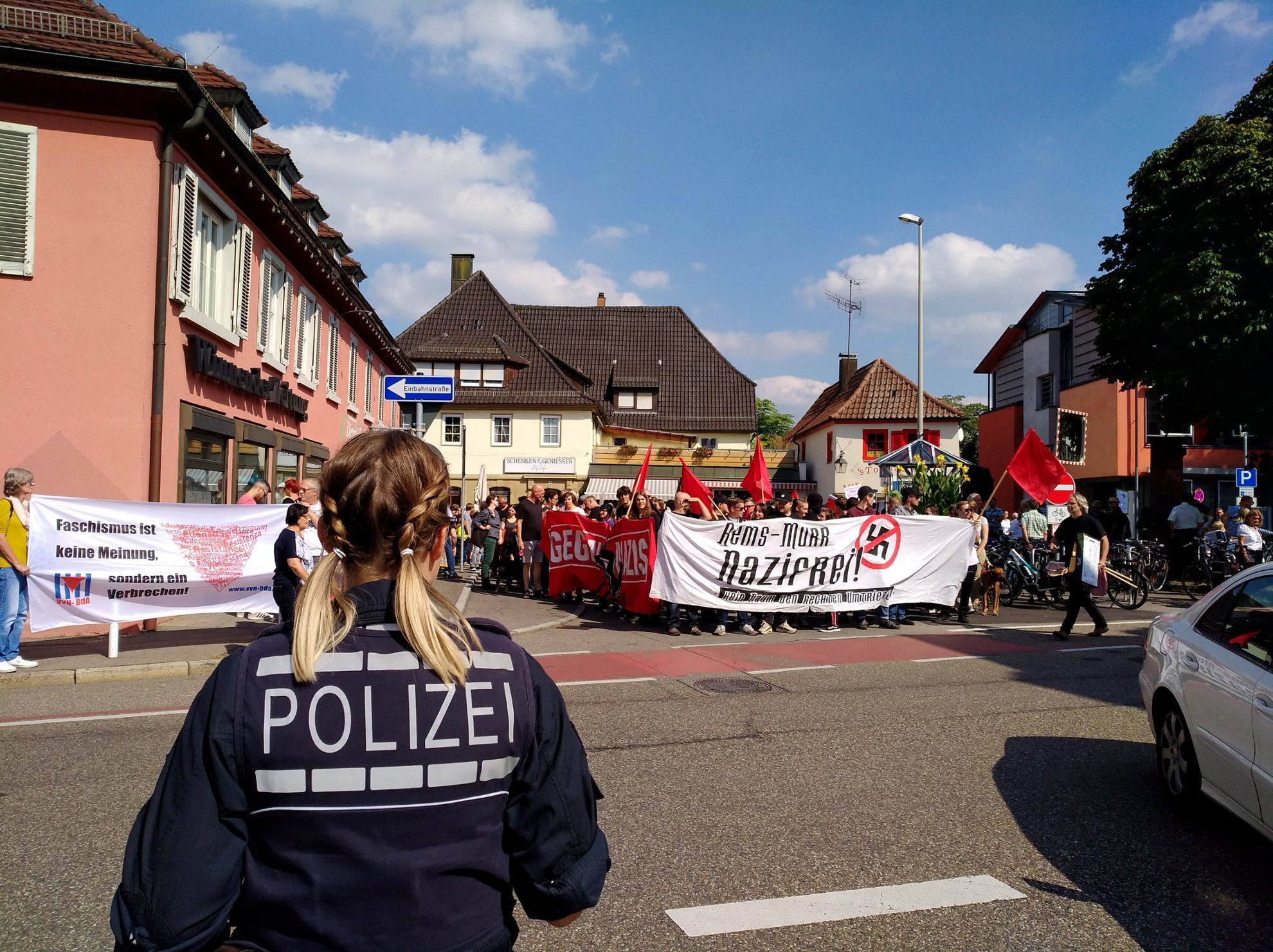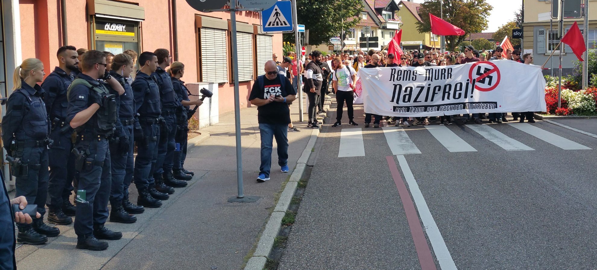 An die Kundgebung schloss sich eine nicht genehmigte Demonstration zum Bahnhof an, die von der Polizei begleitet wurde. Die Veranstaltung verlief bis Redaktionsschluss (14 Uhr) friedlich. Erwähnenswert sind zwei Vorkommnisse:  Vor der Kundgebung hat ein bekannter Fellbacher Rechtsradikaler Teilnehmer fotografiert, die sich provoziert fühlten und ihrerseits den Mann bedrängten.  Während der Demo hat es einen ominösen Zwischenfall  gegeben. Die Polizei wurde eigenen Angaben zufolge von angeblichen Zeugen zu einer Schlägerei   in der Schmidgallstraße 19 gerufen. Laut Polizeibericht war es dort zu einem überfallartigen Angriff von drei bis fünf vermummten Personen auf einen etwa 30 bis 50 Jahre alten Mann gekommen. Demnach haben die unbekannten Täter den Mann niedergeschlagen und  auf ihn eingetreten. Anschließend flüchteten sie unerkannt in unterschiedliche Richtungen. Der Geschädigte konnte von den eingesetzten Polizeibeamten nicht mehr angetroffen werden. Er wird gebeten sich mit dem Polizeirevier Winnenden unter der Telefonnummer 07195/969030 in Verbindung zu setzen. Es besteht der Verdacht, dass der Vorfall im Zusammenhang mit der Demonstration steht, die in der Nähe parallel stattgefundenen hat.