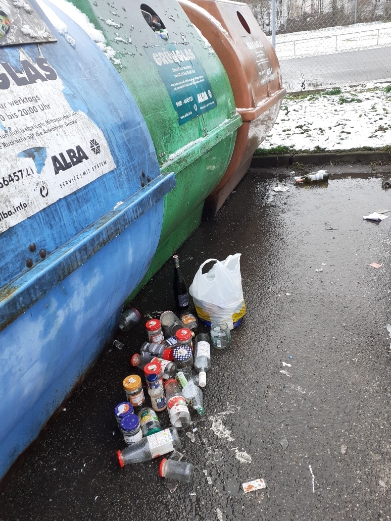 Es ist sehr ärgerlich: Man will als umweltbewusster Bürger sein bissle Altglas von diesem sparsamen Silvester 2020 entsorgen, geht zum Containerplatz und hat keine Chance. Die Container sind gestopft voll, der Platz ist vermüllt, teilweise sind Container regelrecht zugestellt mit großen Abfalltüten. „Die leeren Restflaschen standen und lagen auf dem Platz. Die Kleidersäcke um die Kleidercontainer lagen weit verbreitet, teilweise offen in der Gegend herum“, schreibt uns eine geschätzte