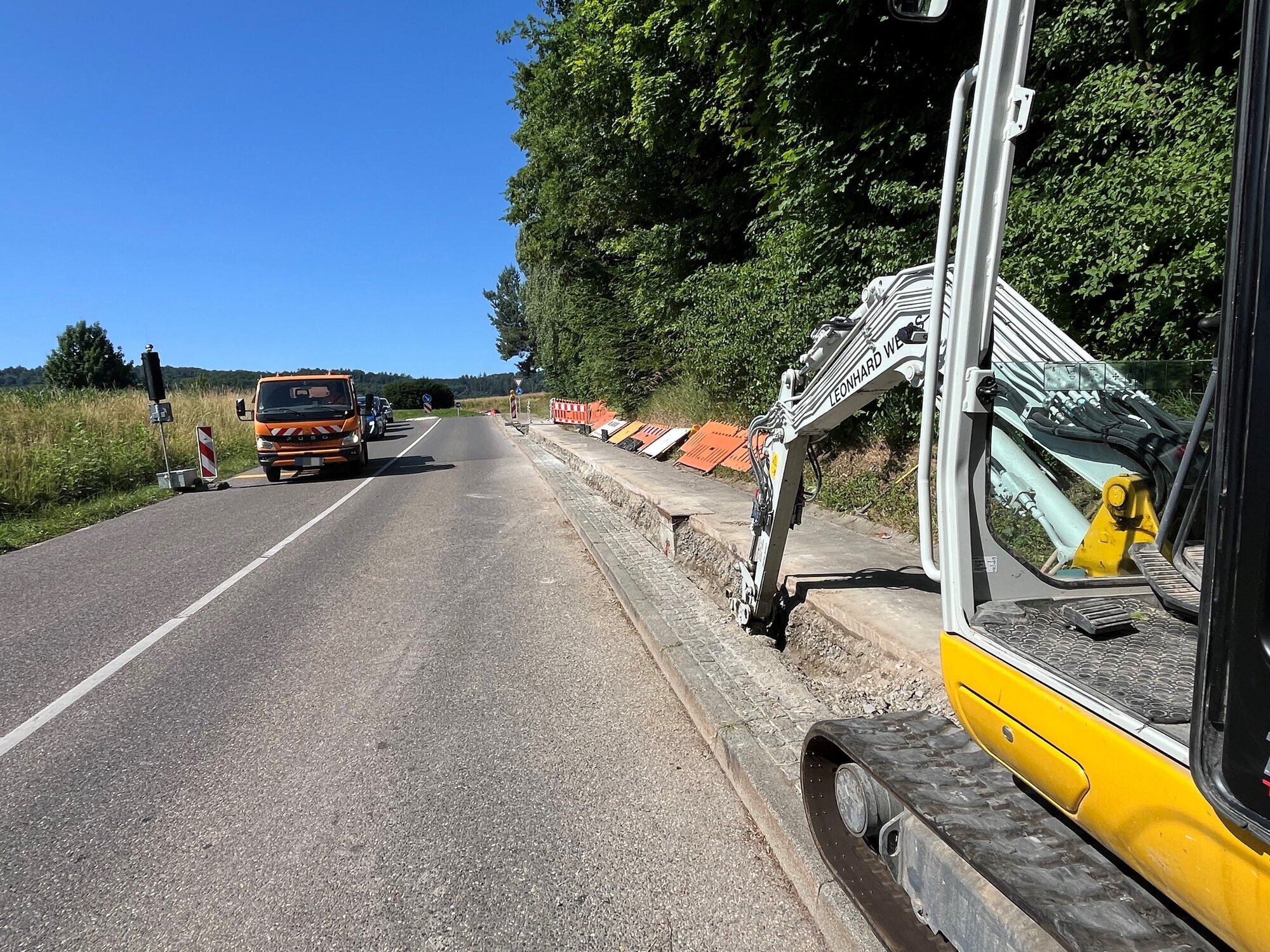 Bereits am Morgen nähern sich die Temperaturen der 30-Grad-Marke. Wer schweren Arbeiten im Freien nachgeht, ist nicht zu beneiden. So zum Beispiel die Bauarbeiter, die mit der Maßnahme bei Höfen betraut sind. Die Arbeiten