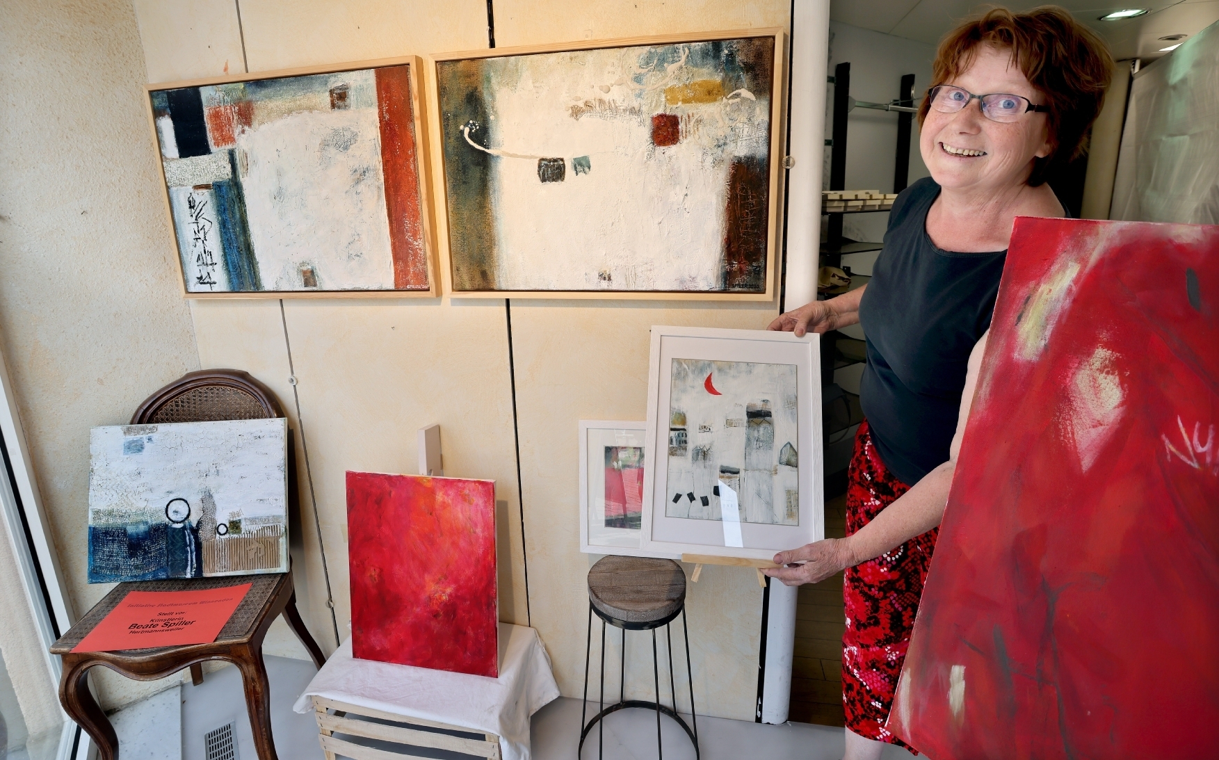 Das Gesicht auf dem Foto kenne ich doch ... das freundliche Lächeln zu diesen verspielt-kleinteiligen Bildern oder zu den selbstbewussten Rottönen dürfte einigen bekannt vorkommen: Künstlerin Beate Spiller war bis zur Rente Verkäuferin bei der Bio-Bäckerei Weber. Tagsüber Brot und Brezeln, viel Umgang mit Menschen, abends und am Wochenende Bilder aus Acrylfarbe, Linolschnitte oder Materialcollagen, allein im Künstlerinnenkeller.
