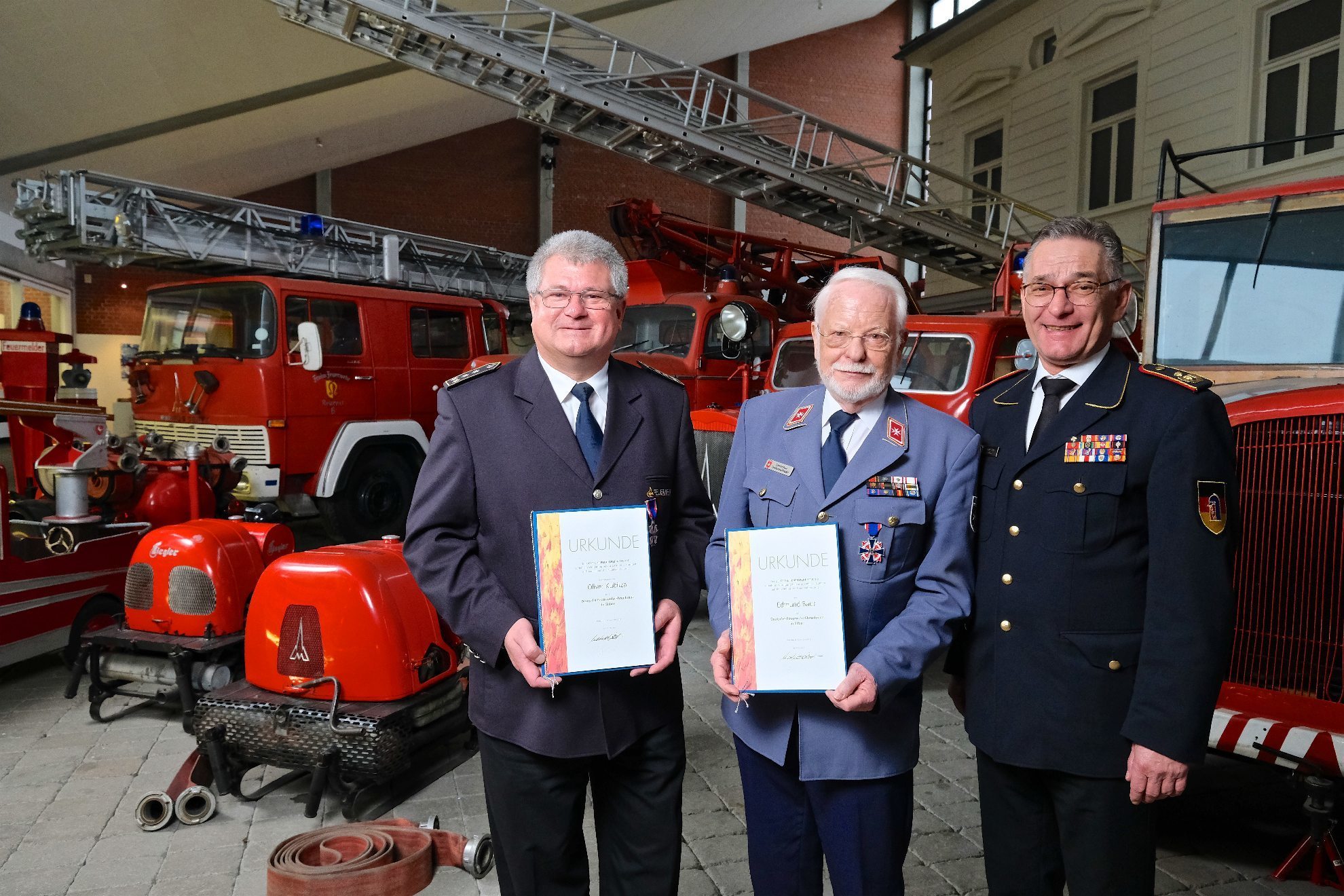 Bei der bundesweiten Ehrungsveranstaltung des Feuerwehrfachverbandes im Deutschen Feuerwehrmuseum in Fulda erhielten Emdund Baur (Malteser) und Oliver Kubitza von der Feuerwehr Winnenden das Feuerwehr-Ehrenkreuz.