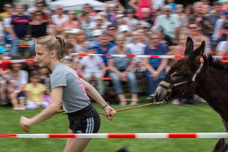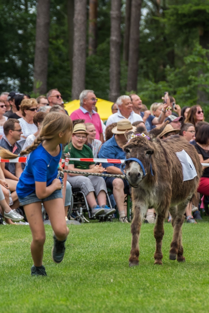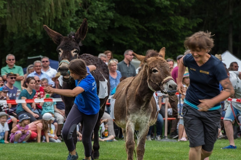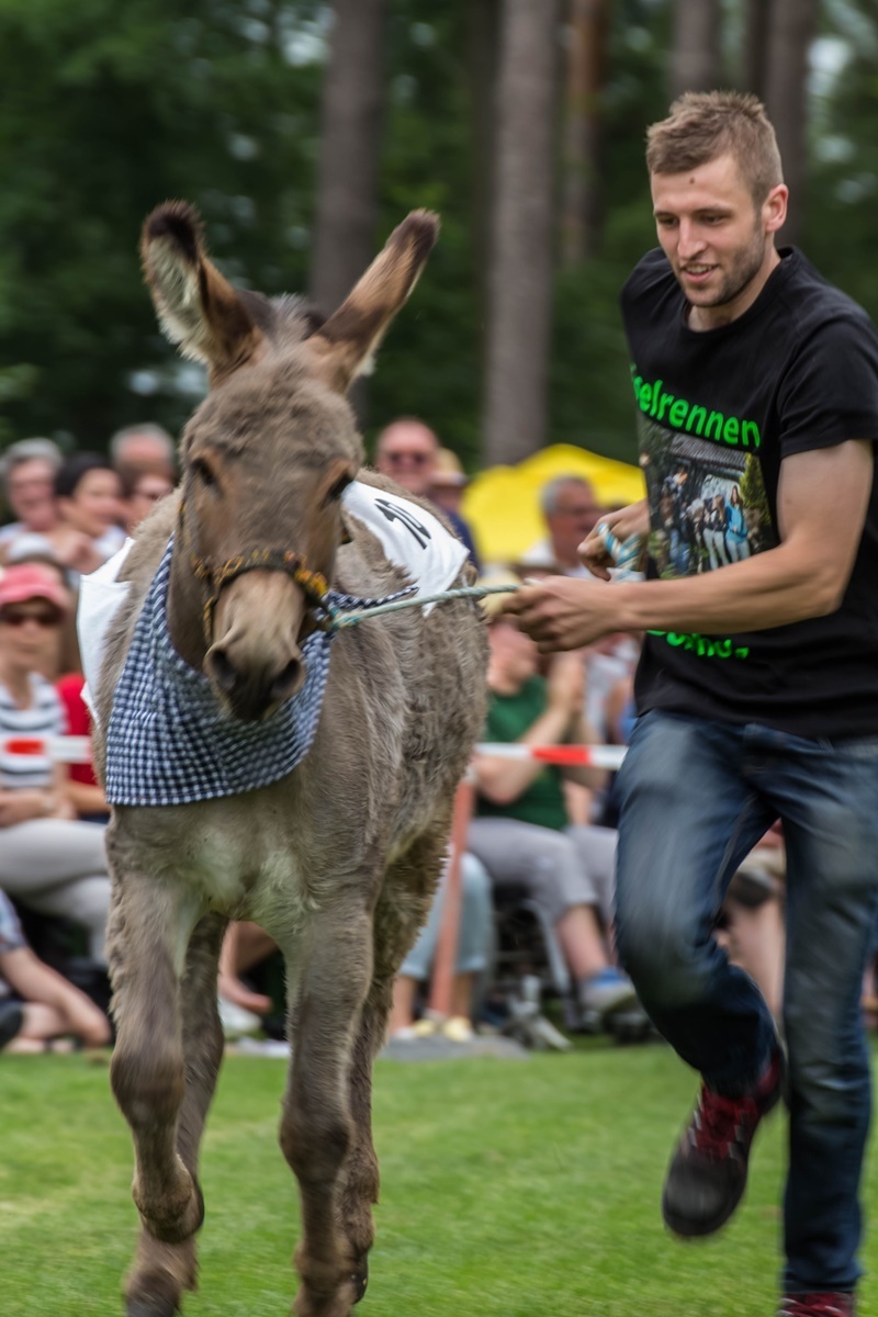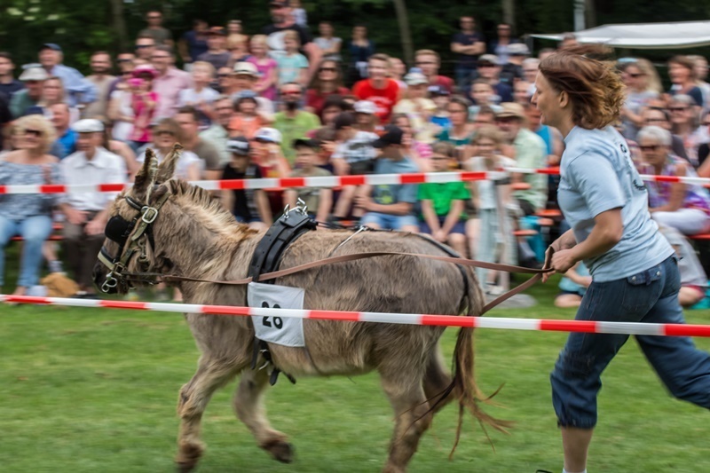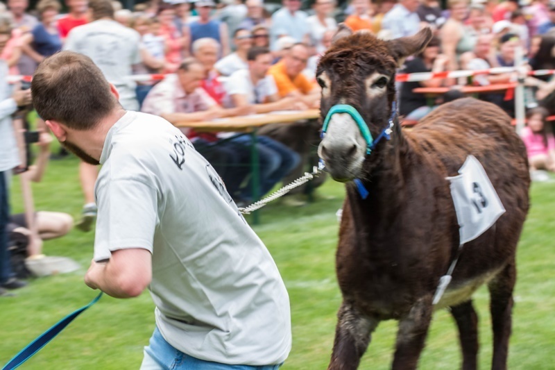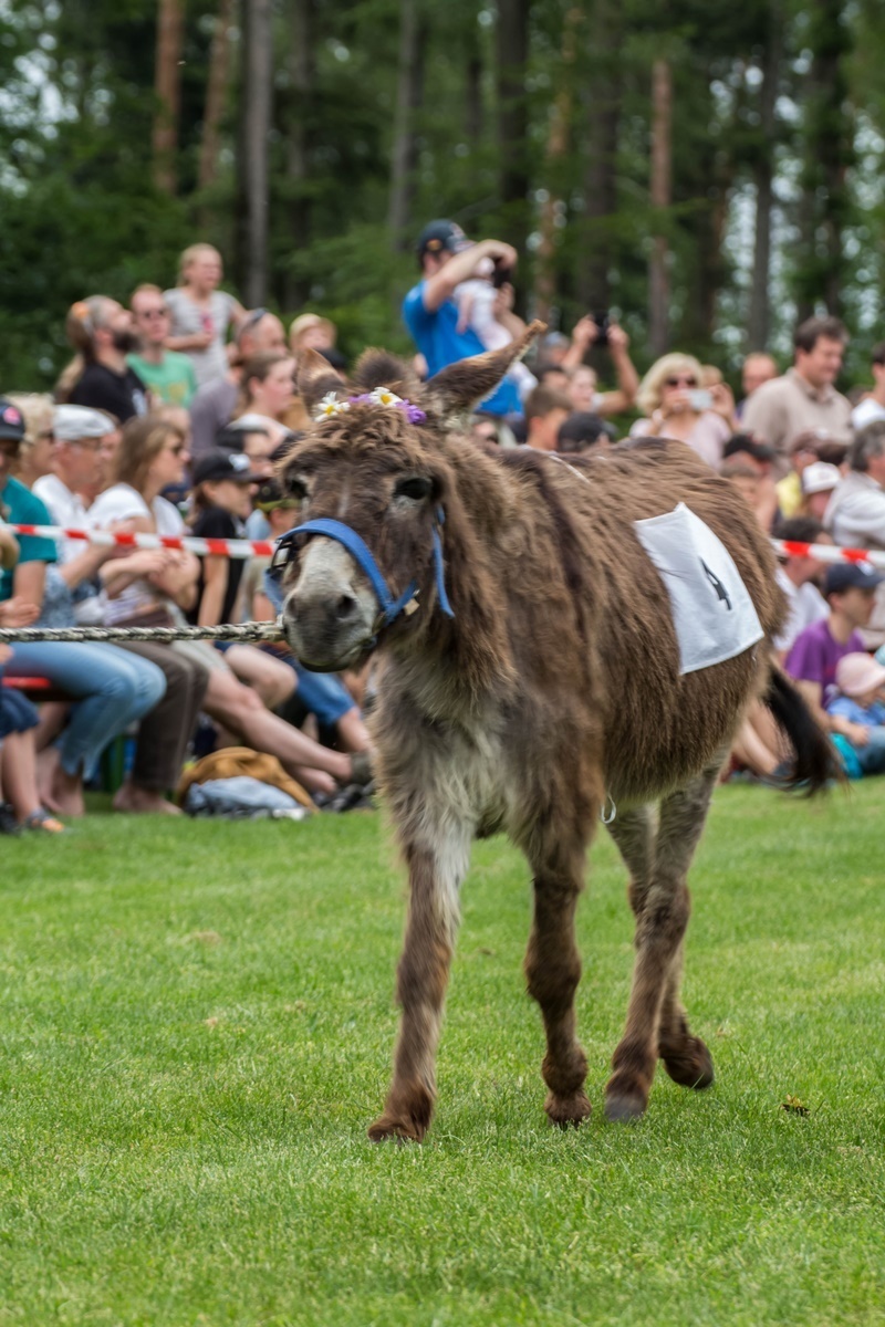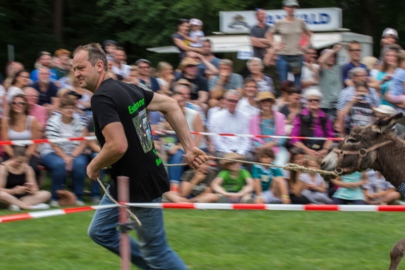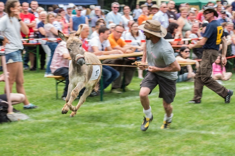 Als „Auswechselspieler“ springt Esel Pippo für die kurzfristig verhinderte Eselin Lucy ein und rast im Eselgalopp direkt ins Halbfinale. Den Eselführern kann es aber auch anders ergehen: An der Leine ziehen? Ganz schlechte Idee, wie der Begleiter von Venus mitten auf der Rennstrecke erfährt: Das Seil zwischen Zügel und Hand gespannt wie eine Wäscheleine, die Eselin bockt. Bis gerade eben hat Venus die Eselschnauze vorn. Plötzlicher Stimmungswechsel, ohne Vorankündigung geht sie keinen Schritt weiter. Gegen diese fellige Bastion des Widerstands helfen weder Streicheleinheiten noch gute Worte und auch kein Applaus von der Seite. Der Rückwärtsgang der 27-jährigen Seniorin wird immer stärker, die Verfolgerin Nelly holt auf. Leichtfüßig trabt das Tier vorbei und beschert Venus einen geruhsamen Nachmittag im Rennstall.