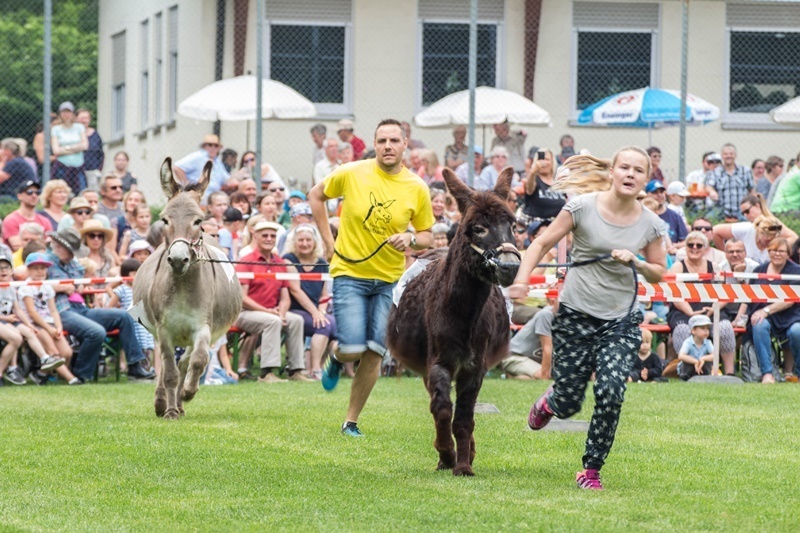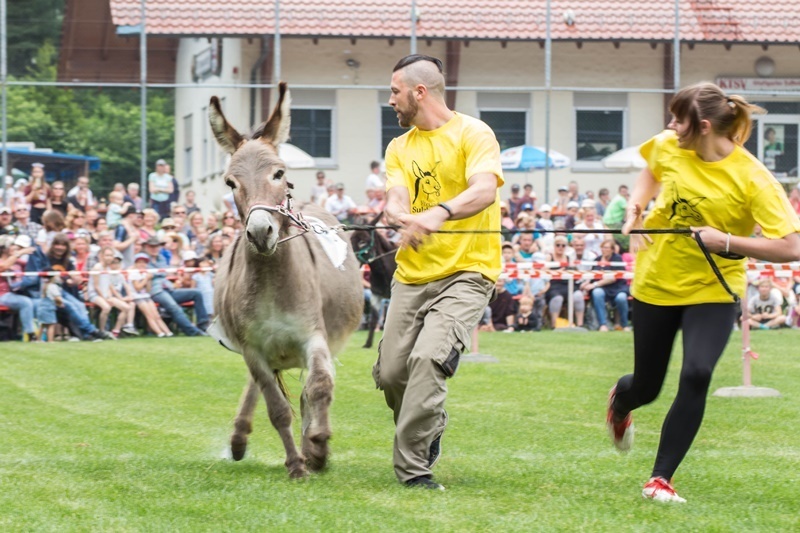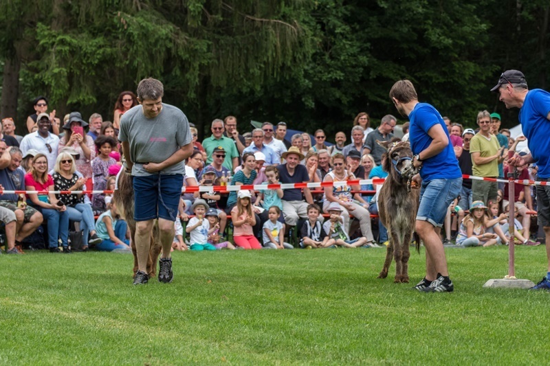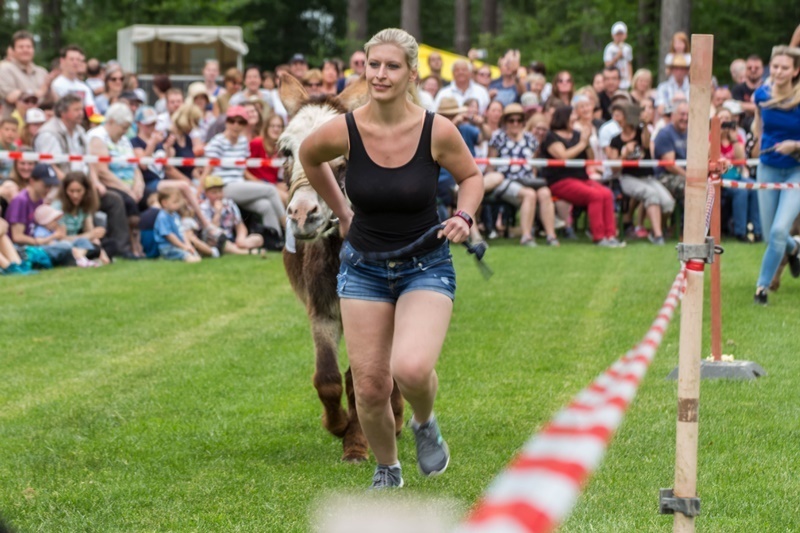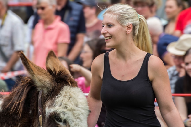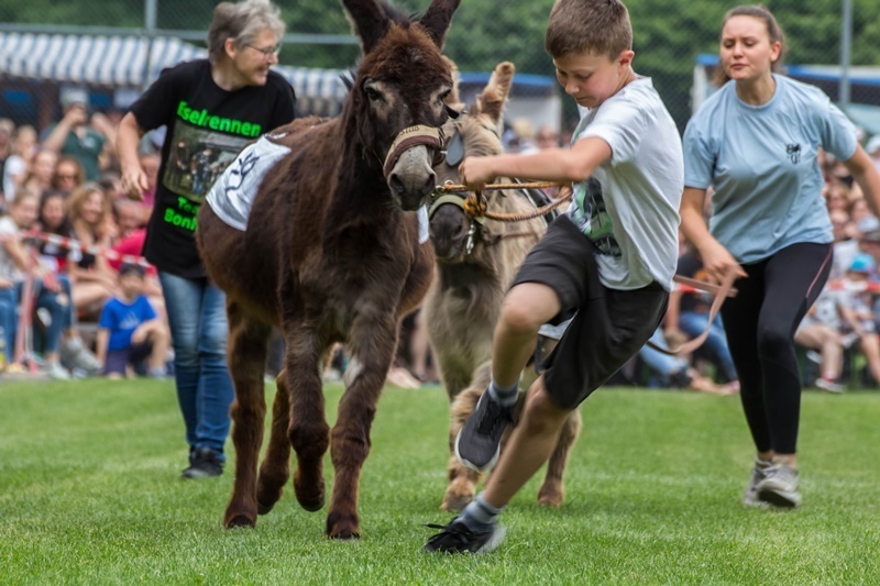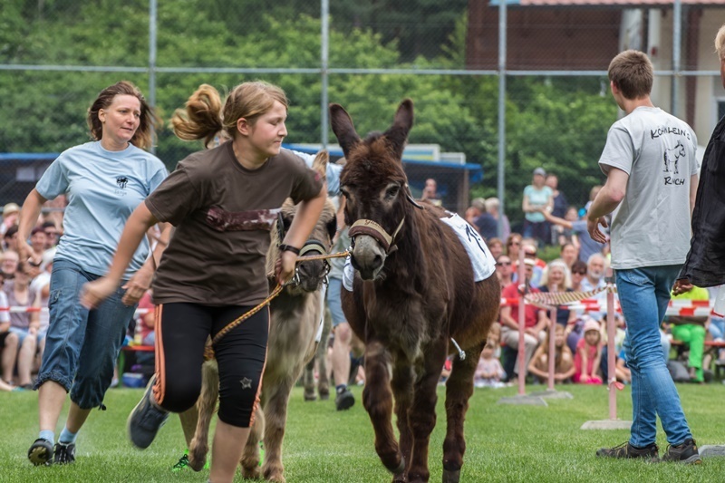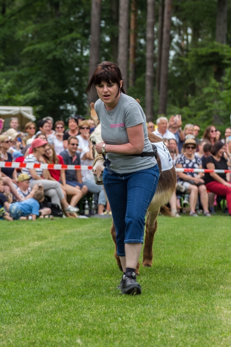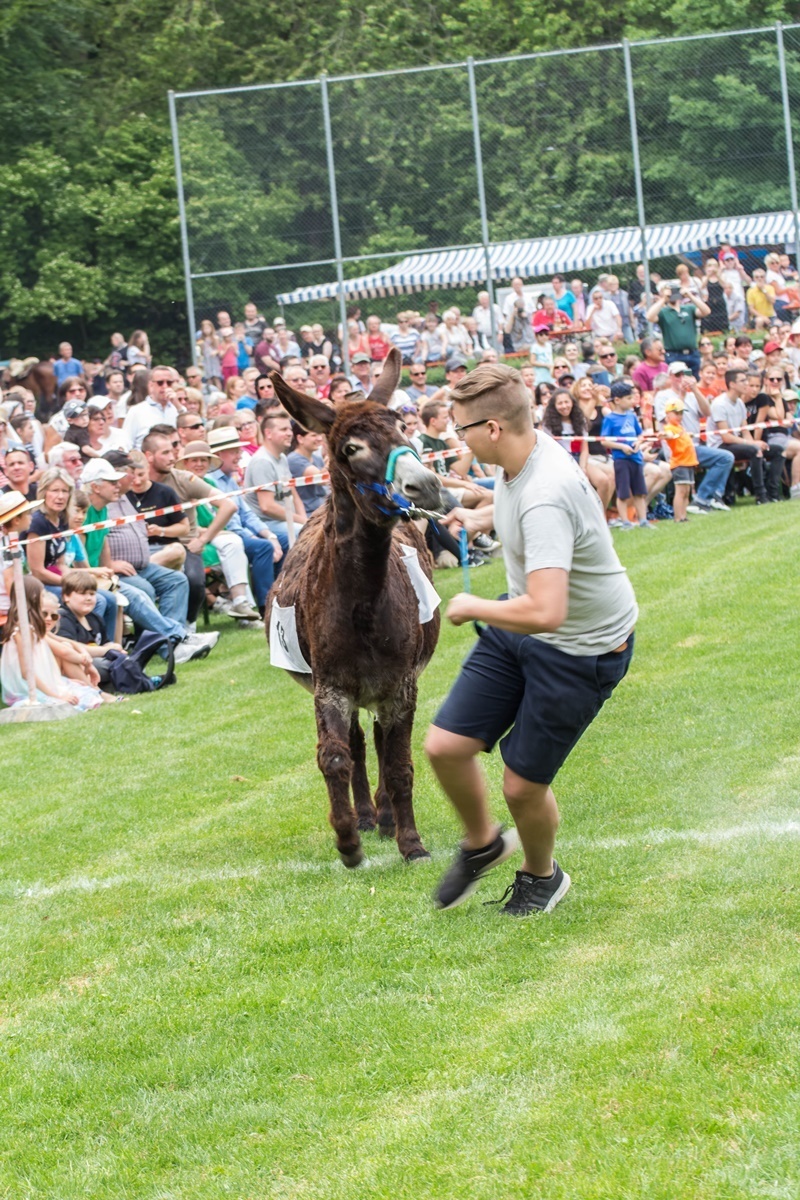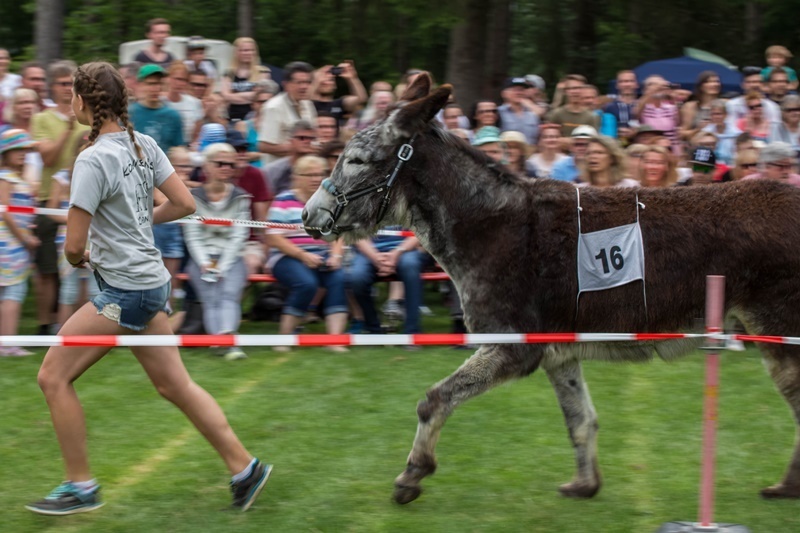 Als „Auswechselspieler“ springt Esel Pippo für die kurzfristig verhinderte Eselin Lucy ein und rast im Eselgalopp direkt ins Halbfinale. Den Eselführern kann es aber auch anders ergehen: An der Leine ziehen? Ganz schlechte Idee, wie der Begleiter von Venus mitten auf der Rennstrecke erfährt: Das Seil zwischen Zügel und Hand gespannt wie eine Wäscheleine, die Eselin bockt. Bis gerade eben hat Venus die Eselschnauze vorn. Plötzlicher Stimmungswechsel, ohne Vorankündigung geht sie keinen Schritt weiter. Gegen diese fellige Bastion des Widerstands helfen weder Streicheleinheiten noch gute Worte und auch kein Applaus von der Seite. Der Rückwärtsgang der 27-jährigen Seniorin wird immer stärker, die Verfolgerin Nelly holt auf. Leichtfüßig trabt das Tier vorbei und beschert Venus einen geruhsamen Nachmittag im Rennstall.