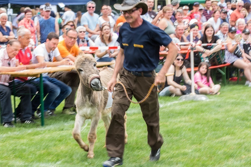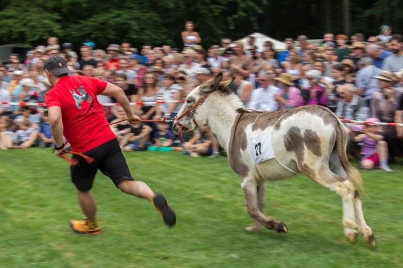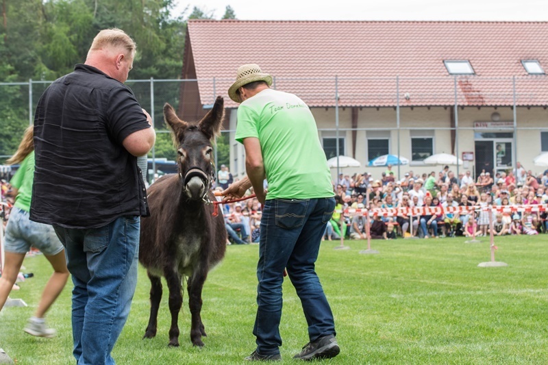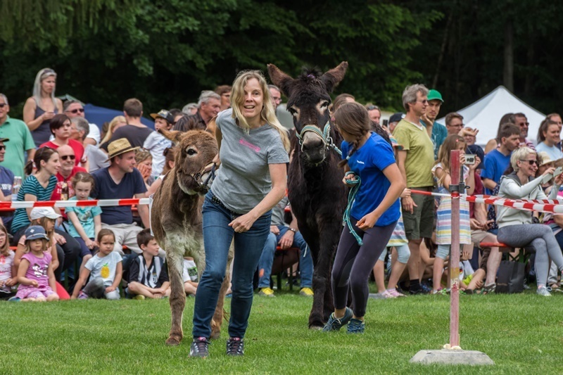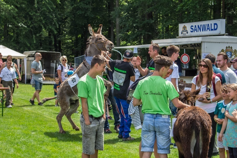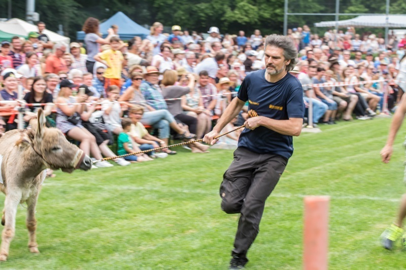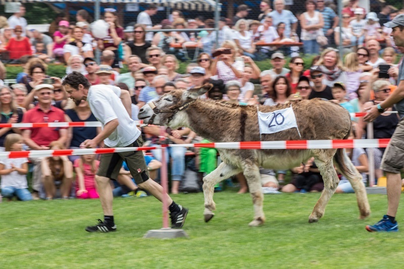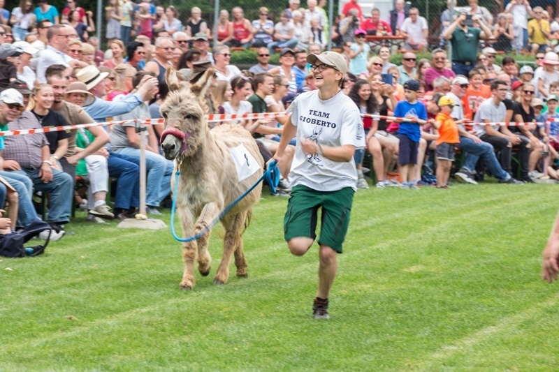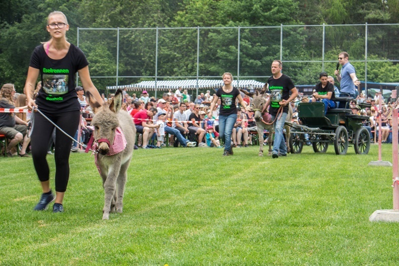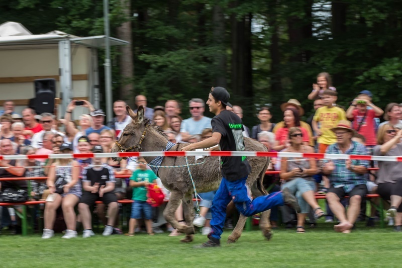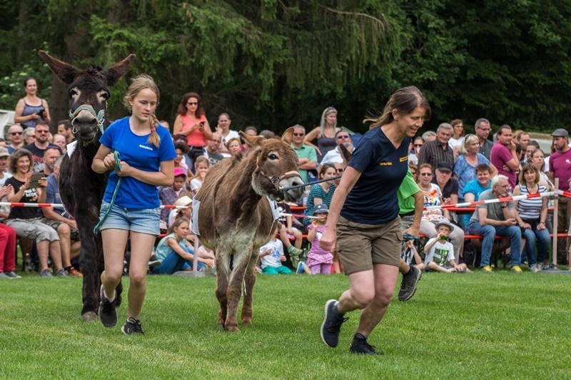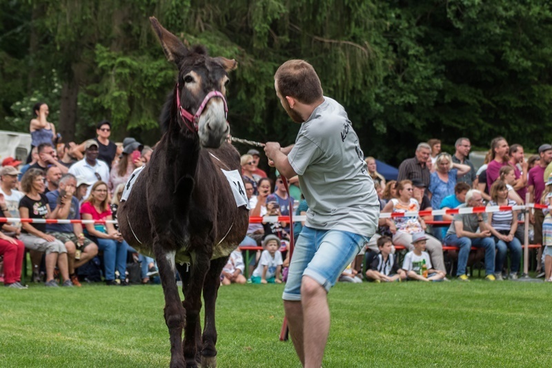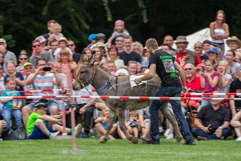 Als „Auswechselspieler“ springt Esel Pippo für die kurzfristig verhinderte Eselin Lucy ein und rast im Eselgalopp direkt ins Halbfinale. Den Eselführern kann es aber auch anders ergehen: An der Leine ziehen? Ganz schlechte Idee, wie der Begleiter von Venus mitten auf der Rennstrecke erfährt: Das Seil zwischen Zügel und Hand gespannt wie eine Wäscheleine, die Eselin bockt. Bis gerade eben hat Venus die Eselschnauze vorn. Plötzlicher Stimmungswechsel, ohne Vorankündigung geht sie keinen Schritt weiter. Gegen diese fellige Bastion des Widerstands helfen weder Streicheleinheiten noch gute Worte und auch kein Applaus von der Seite. Der Rückwärtsgang der 27-jährigen Seniorin wird immer stärker, die Verfolgerin Nelly holt auf. Leichtfüßig trabt das Tier vorbei und beschert Venus einen geruhsamen Nachmittag im Rennstall.