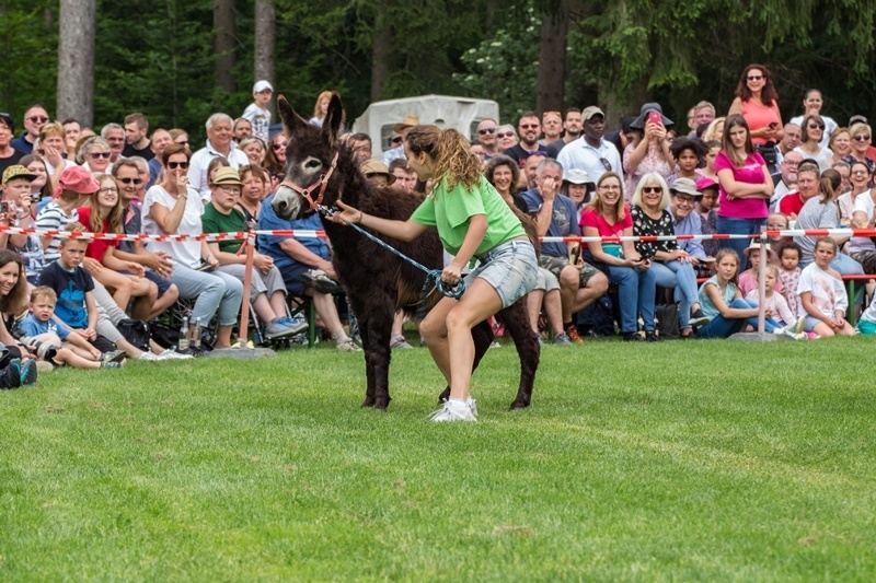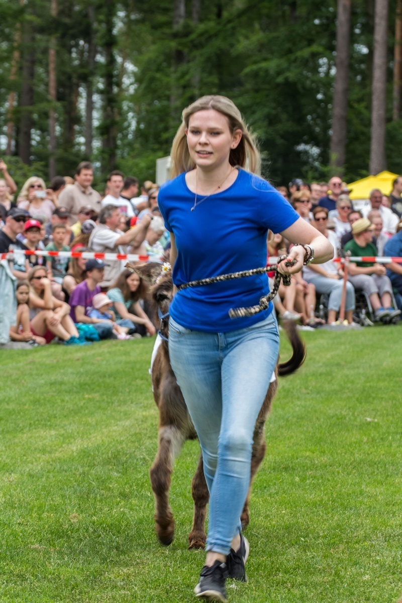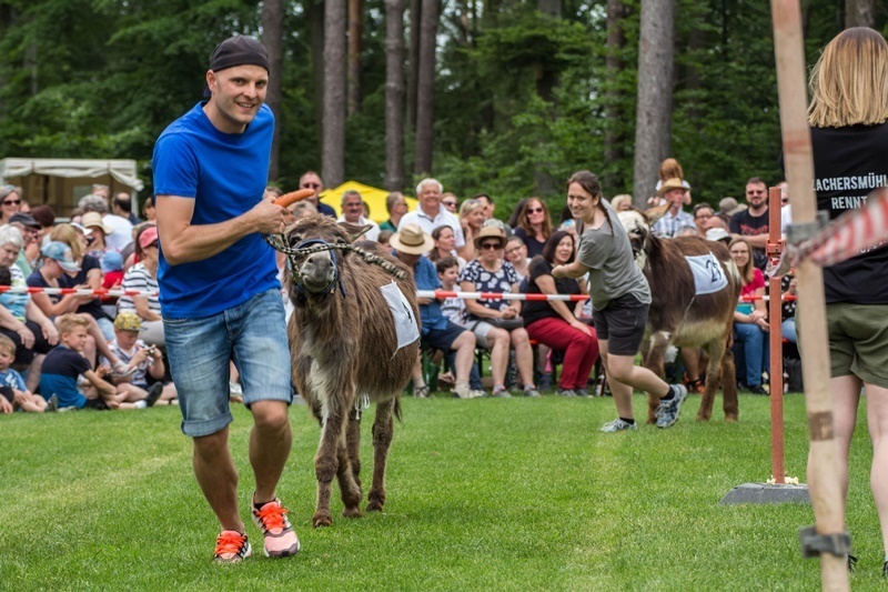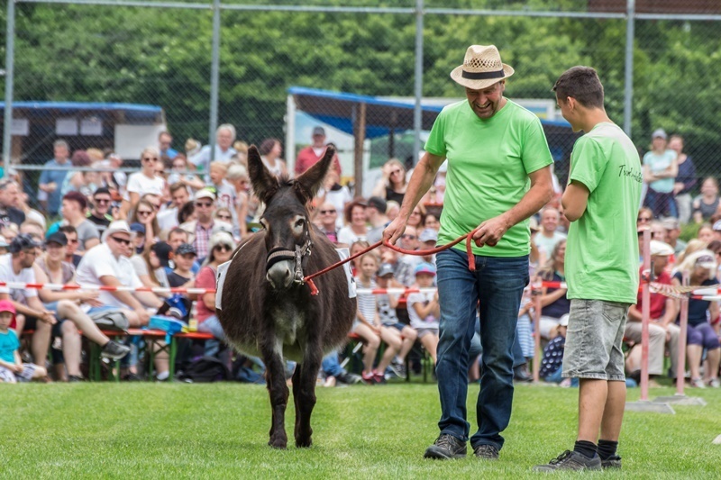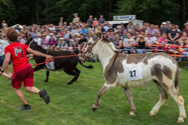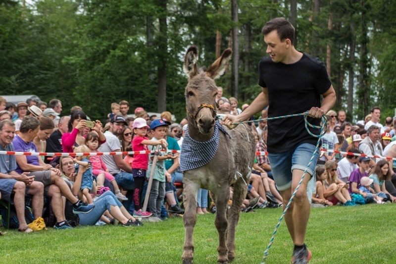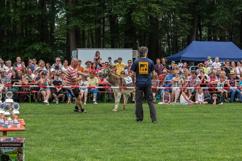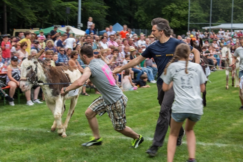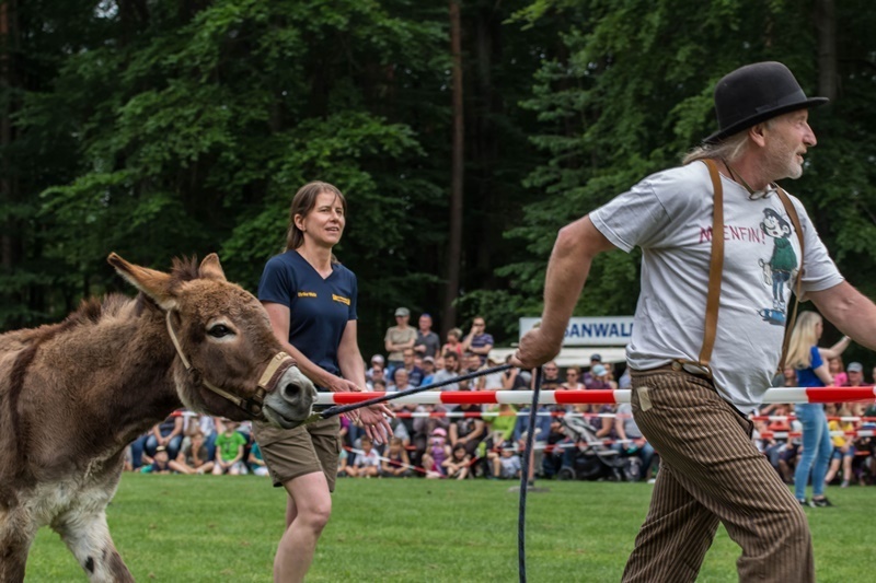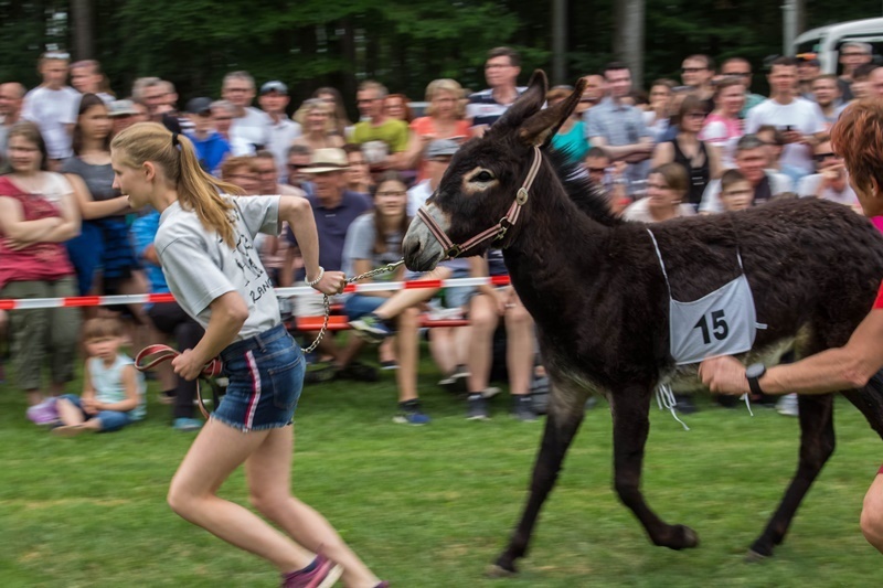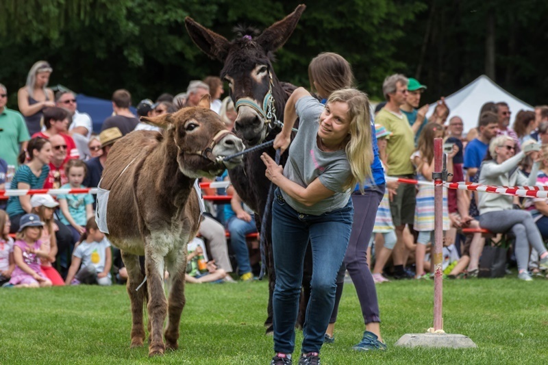 Als „Auswechselspieler“ springt Esel Pippo für die kurzfristig verhinderte Eselin Lucy ein und rast im Eselgalopp direkt ins Halbfinale. Den Eselführern kann es aber auch anders ergehen: An der Leine ziehen? Ganz schlechte Idee, wie der Begleiter von Venus mitten auf der Rennstrecke erfährt: Das Seil zwischen Zügel und Hand gespannt wie eine Wäscheleine, die Eselin bockt. Bis gerade eben hat Venus die Eselschnauze vorn. Plötzlicher Stimmungswechsel, ohne Vorankündigung geht sie keinen Schritt weiter. Gegen diese fellige Bastion des Widerstands helfen weder Streicheleinheiten noch gute Worte und auch kein Applaus von der Seite. Der Rückwärtsgang der 27-jährigen Seniorin wird immer stärker, die Verfolgerin Nelly holt auf. Leichtfüßig trabt das Tier vorbei und beschert Venus einen geruhsamen Nachmittag im Rennstall.