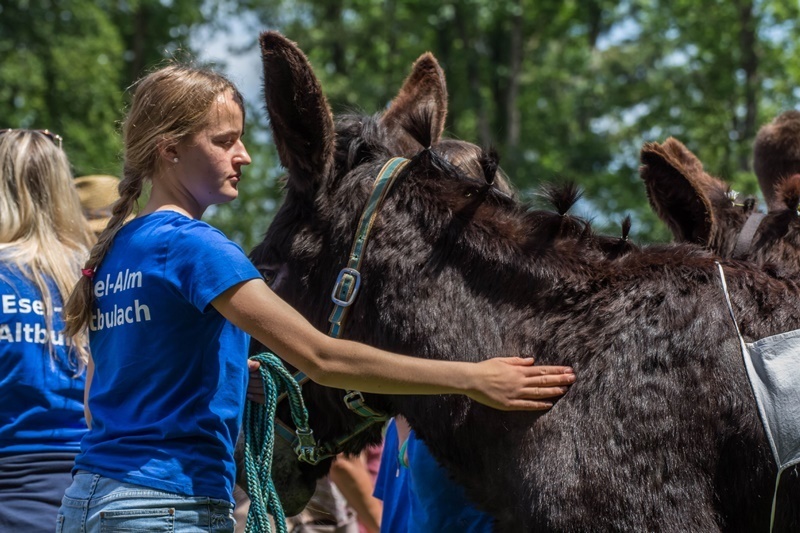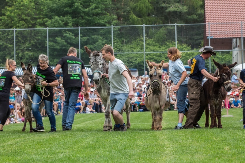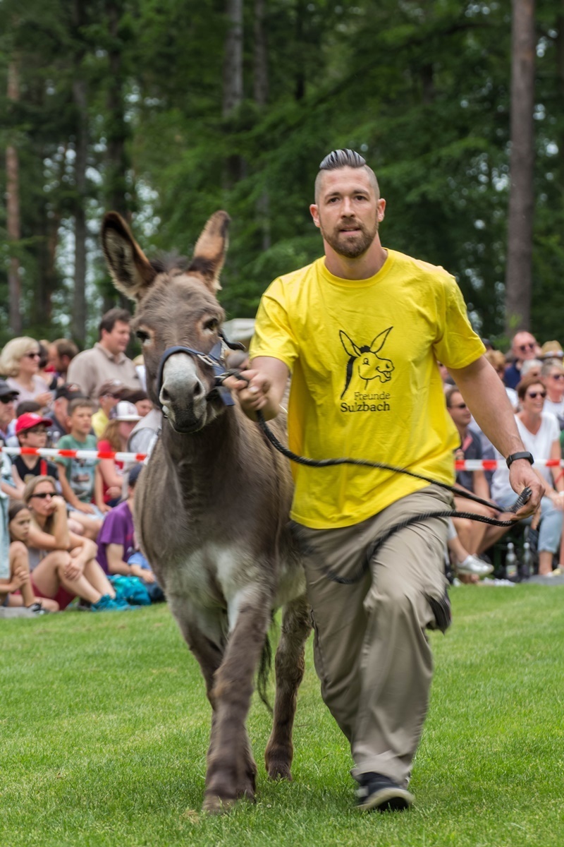 Oder streckt der Esel Benjamin sein Köpfchen etwa den vielen Hobby-Fotografen entgegen? „Er ist halt fotogen“, verrät Eselhalter Arno Speckmaier. Zum vierten Mal steht der Hausesel mit seinem weißen Bauch, heller Schnauze und 25 Lenzen auf dem Buckel ganz scherrig im Starterfeld. „Der will raus, der will mitmachen“, sagt Arno Speckmaier. „Seine Mädels müsste man überreden, aber er bewegt sich gern.“ Esel Benjamin lebt zusammen mit drei Eseldamen in der Tieroase der Laufenmühle bei Welzheim – in einer Werkstatt für behinderte Menschen. „Das Eselrennen ist für unsere Bewohner ein Riesenevent“, meint Arno Speckmaier.