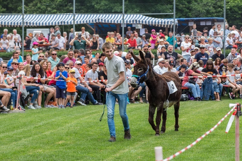 Das Publikum applaudiert und schickt Applauswellen herum für dieses Überholmanöver im Zeitlupengang. „Dass Esel überhaupt rennen“, staunt ein Zuschauer. Und wie sie rennen können: Windschnittig sehen Mojito, Gioberto und Jolly Jumper aus, die mit durchgestrecktem Hals schon im Vorlauf klarmachen, wer Chef im Ring ist. Hanni hingegen ist in Zeitlupe unterwegs: Mit sanftem Zureden lässt sie sich immerhin zu einer der drei Vorlauf-Runden bewegen und verlässt mit stolz gehobenem Kopf die Arena. „Die ist schlau, sie hatte ihre Runde Auslauf und chillt jetzt wohl lieber“, kommentiert ein Mann den kräftesparenden Auftritt.