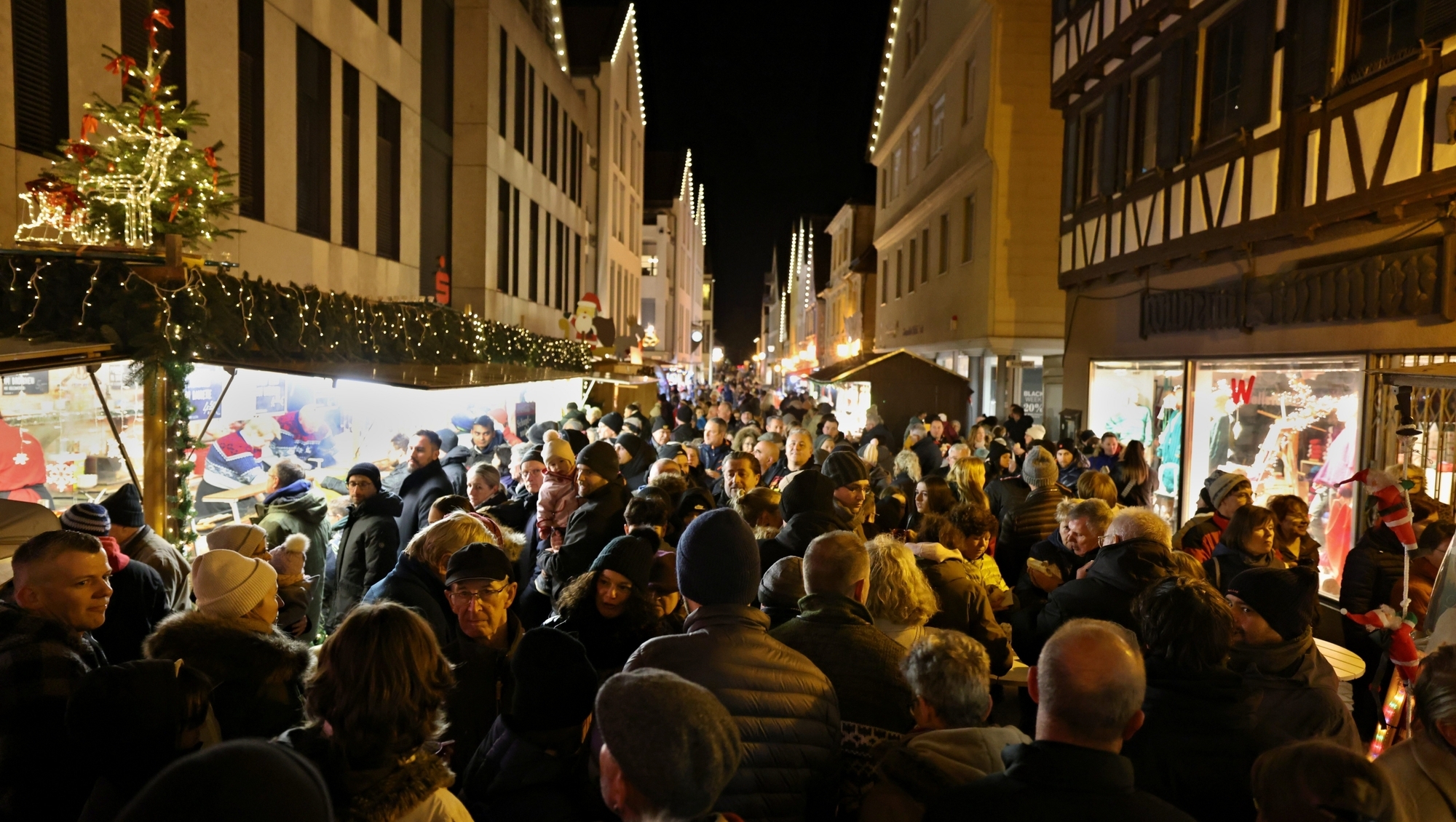 Wohliges Gedränge, stellenweise Geschiebe auf dem Weihnachtsmarkt am Abend vor dem ersten Advent. Anders als noch in der Woche zuvor ist es angemessen winterlich kalt, so dass die Stände, an denen heißer Glühwein und Punsch zu haben sind, großen Zulauf haben. Viele Hände wärmen sich klammernd an Becher und Tassen.