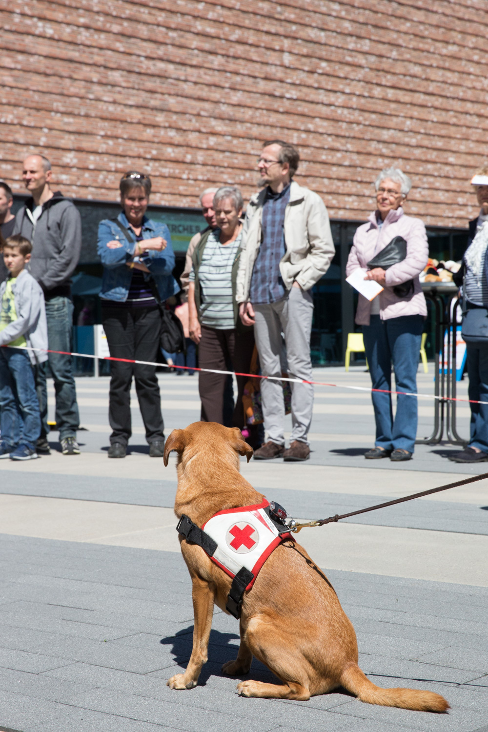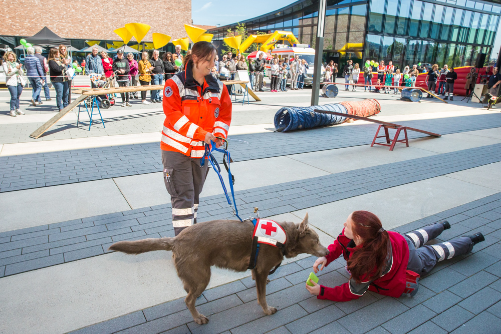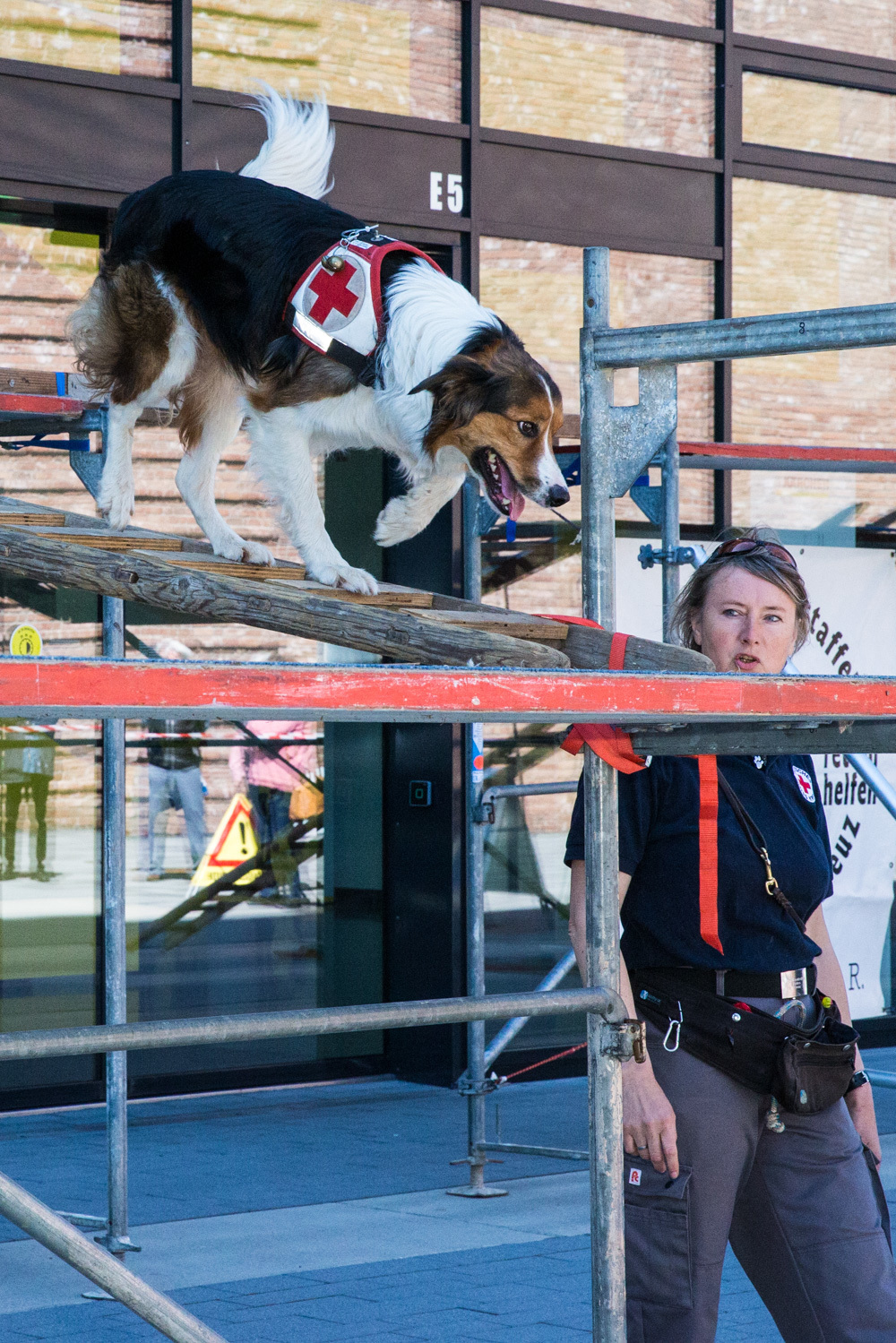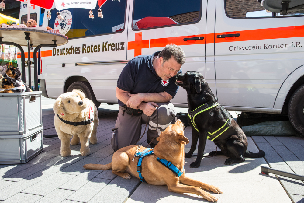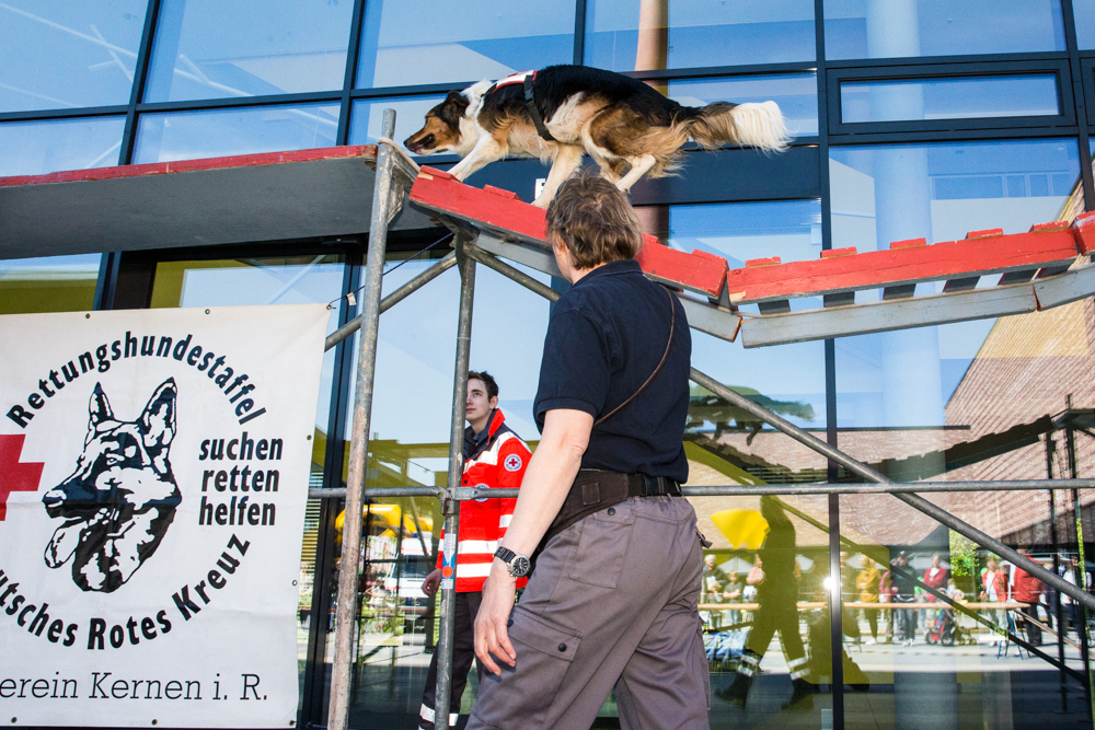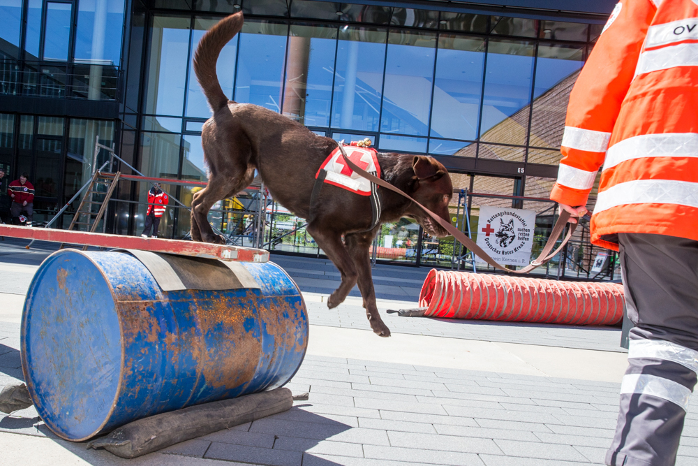 Eine Attraktion für die ganze Familie waren jedes Mal die Vorführungen der Rettungshundestaffel des Roten Kreuzes im Außenbereich. Hier zeigten die Hunde, wie sie vermisste Personen aufspüren und dann anzeigen. Jeder Hund individuell verschieden. Was auch mal – bei allem Ernst des eventuellen Notfalls – schon mal für Heiterkeit sorgte, etwa wenn der zottelige „Jacko“ außer der Reihe noch eine Extrabelohnung aus der Dose des „Vermissten“ erschnappen wollte. Lachenden Beifall gab es aber auch für ihn.