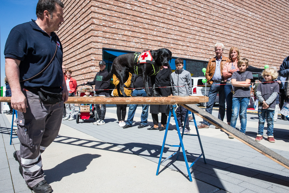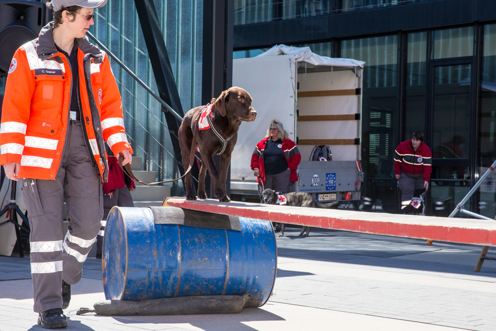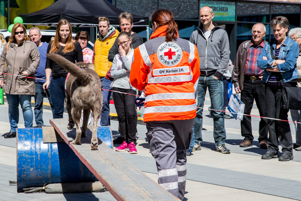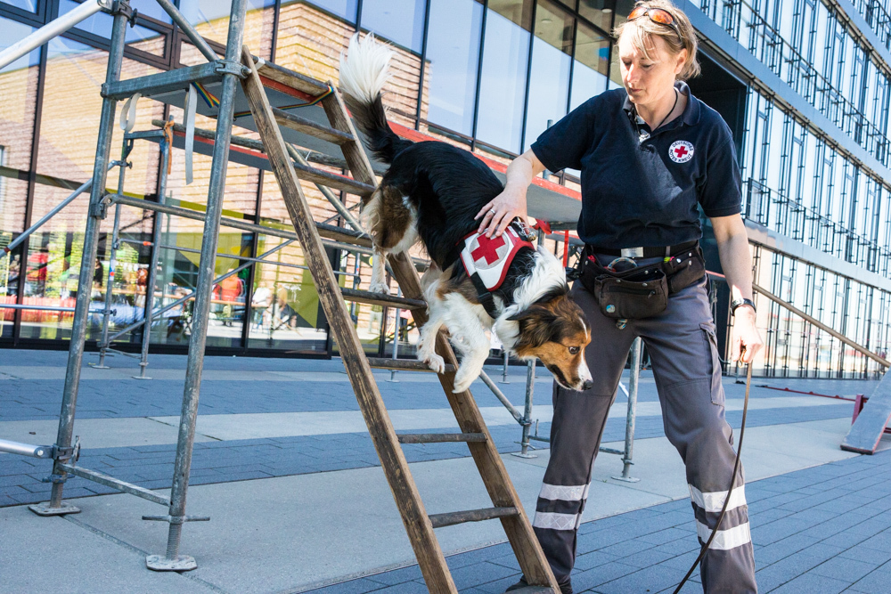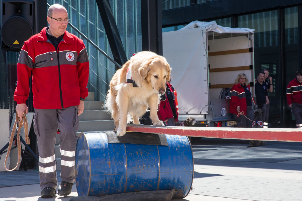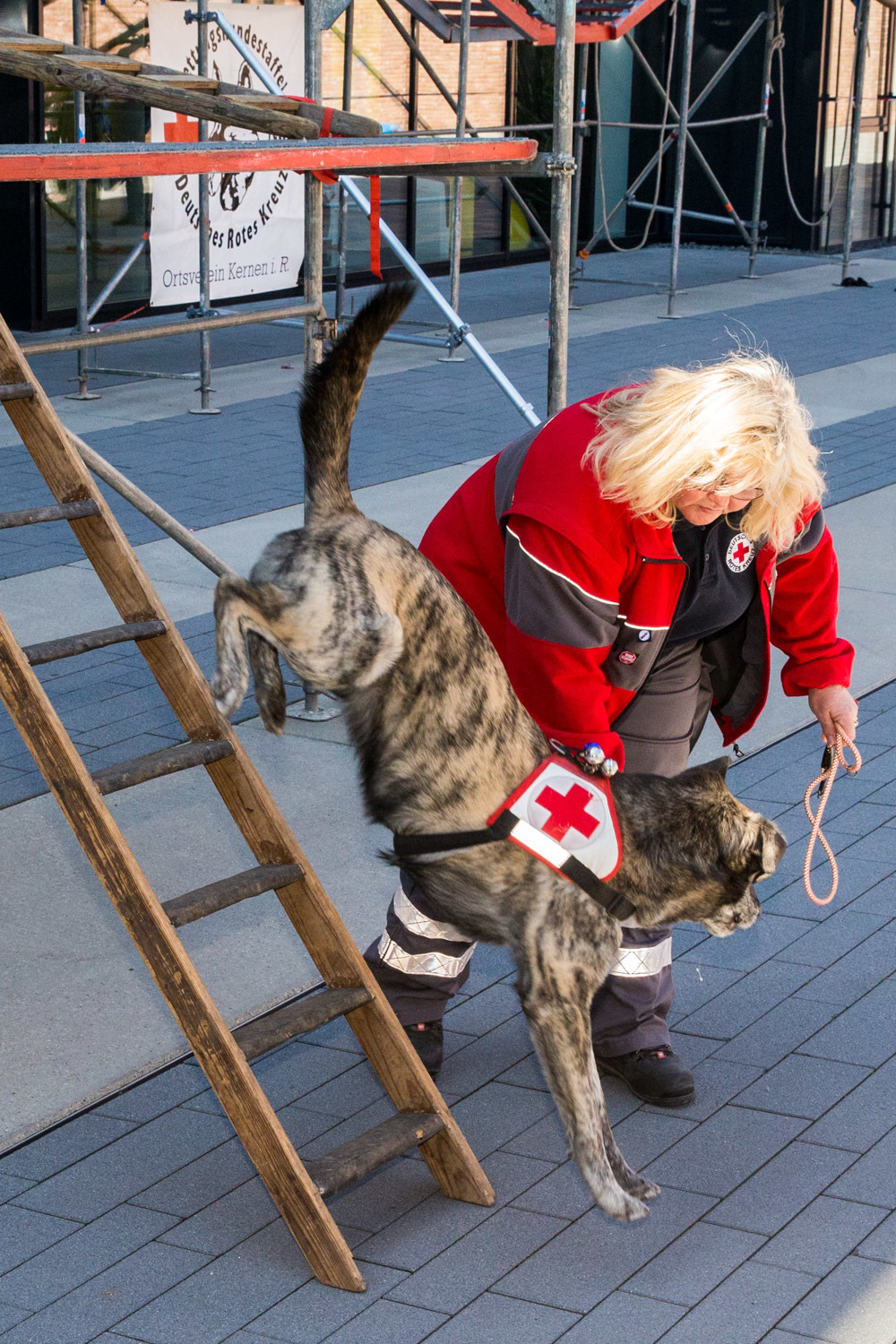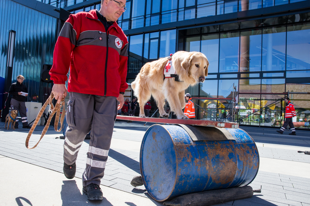 Eine Attraktion für die ganze Familie waren jedes Mal die Vorführungen der Rettungshundestaffel des Roten Kreuzes im Außenbereich. Hier zeigten die Hunde, wie sie vermisste Personen aufspüren und dann anzeigen. Jeder Hund individuell verschieden. Was auch mal – bei allem Ernst des eventuellen Notfalls – schon mal für Heiterkeit sorgte, etwa wenn der zottelige „Jacko“ außer der Reihe noch eine Extrabelohnung aus der Dose des „Vermissten“ erschnappen wollte. Lachenden Beifall gab es aber auch für ihn.