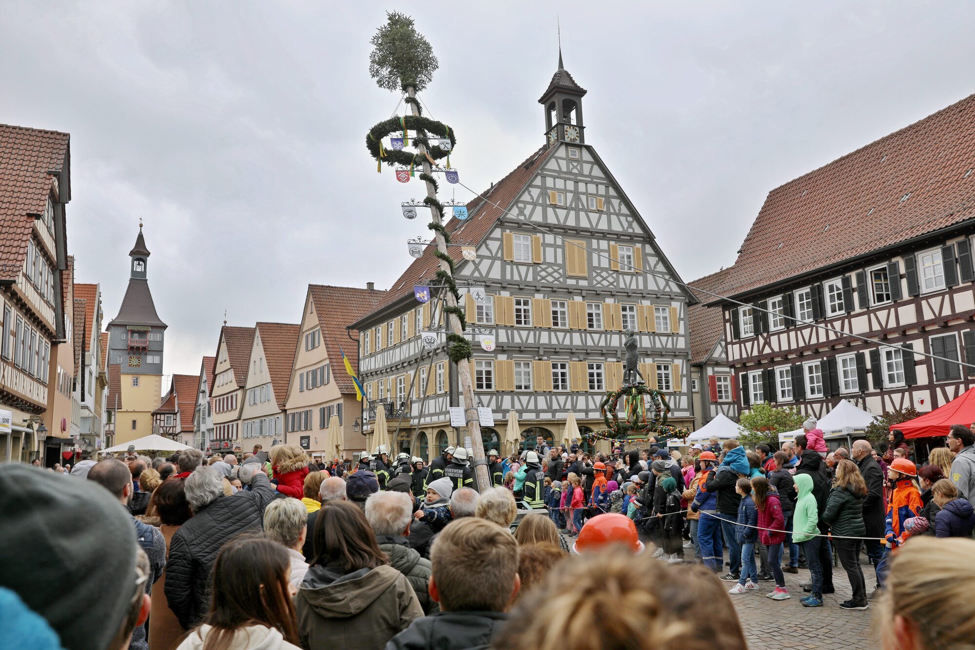 Auf dem Marktplatz in Winnenden sorgen Mitglieder der Feuerwehr für ein Maibaum-Spektakel am Donnerstag, 30. April. Beginn des Festes: 17 Uhr. Um 18 Uhr steigt das eigentliche Highlight: Rund 20 Einsatzkräfte stellen den
