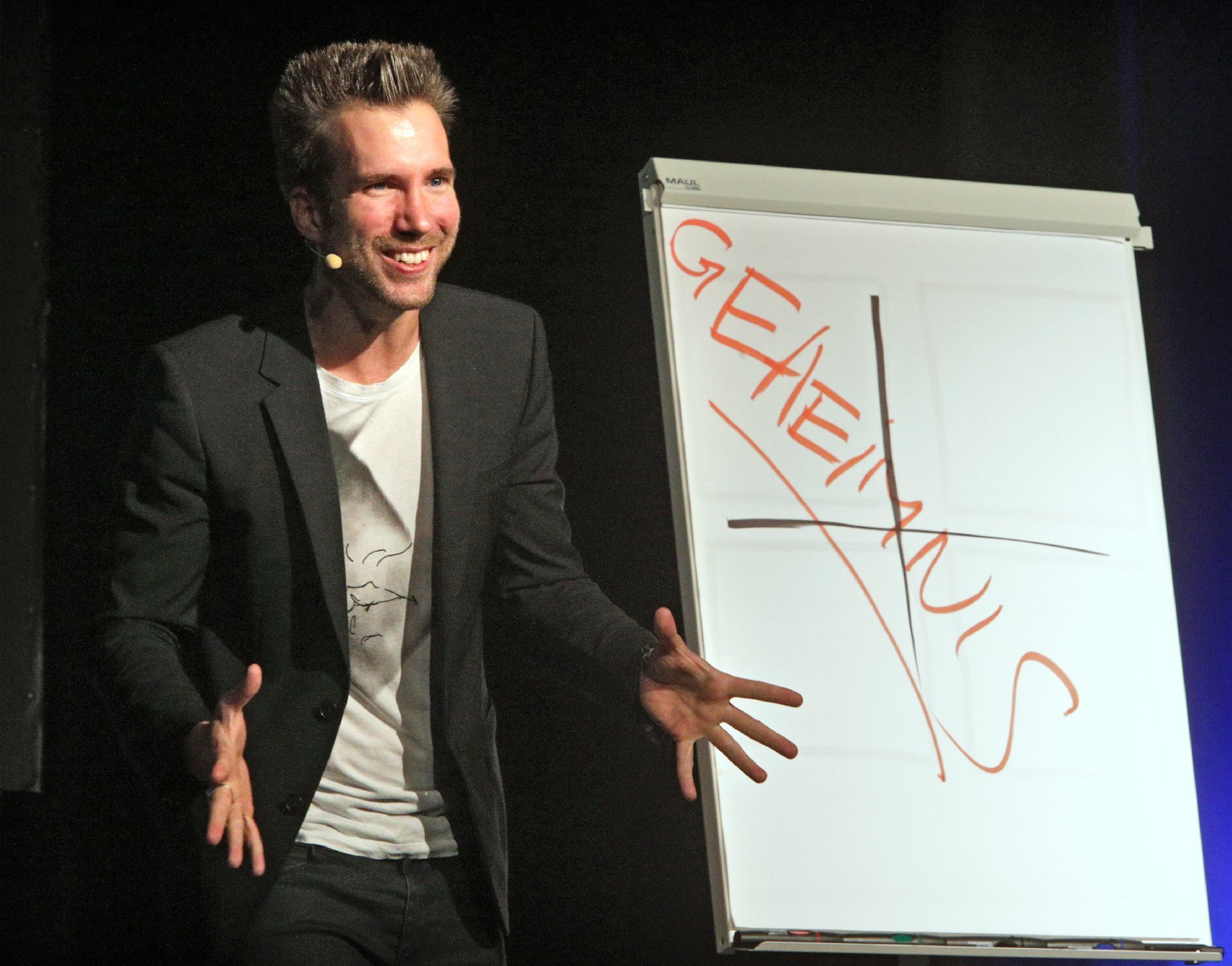 Leutenbach und Alexander Hartmann – keine Liebe auf den ersten Blick. Zunächst fragen sich mehr als 500 meist ältere Zuschauer, wohin sie sich da wohl verlaufen haben, was für eine Art Abo-Unterhaltung dieser junge Typ mit der frechen Schnauze, dem aggressiven Lächeln und der steil nach oben ragenden Frisur wohl im Angebot hat und warum sie diese von Rockfestivals oder Casting Shows bekannten Pop-Show-Rituale befolgen und alle gemeinsam auf Stichworte aufstöhnen oder losjubeln sollen, wenn dies von ihnen erwartet wird. Die Halle ist gepflastert mit seltsamen Sinnsprüchen wie „No Struggle – no Strength“ oder „Willkommen in Ihrer Wirklichkeit“, der Künstler (?) lässt sich von einer jungen Marktschreierin in Stilettos und Abendkleid als „Experten für den Erfolgsfaktor“ ankündigen, verspricht einen Abend voller Sex, Drugs and Rock’n’Roll.