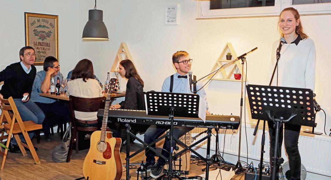 Die Premiere hat Micha Mailänder (27) selbst übernommen, sich mit blauem Hemd, schwarzen Hosenträgern und schwarzer Fliege ans Keyboard gesetzt und zusammen mit seiner WG-Mitbewohnerin Mara Kriegeskotte (19) Balladen, folkige Sachen und auch mal Stücke mit mehr Tempo und Groove gespielt. Ehrensache, dass Freunde und Verwandte die Tische und die Sofa-Sessel-Sitzecke im Lokal reserviert haben und andächtig zuhören. Aber auch an den weiter entfernten Tischen sitzen mitten in der Woche und dazu noch an Weiberfasnacht etliche Leute, die den Tag in dem erst wenige Monate alten Bistro ruhig ausklingen lassen, zu zweit oder zu viert in Gespräche vertieft.