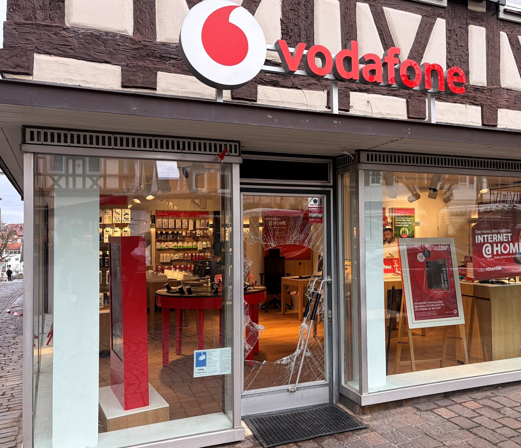 In der Nacht von Dienstag auf Mittwoch sind Unbekannte in das Vodafone-Geschäft am Marktplatz eingedrungen. „Sie haben die Tür eingeschlagen. Wie mit einem Rammbock. Bamm, bamm, bamm“, erzählt der Inhaber am Mittwochmorgen. 20 Handys seien geklaut