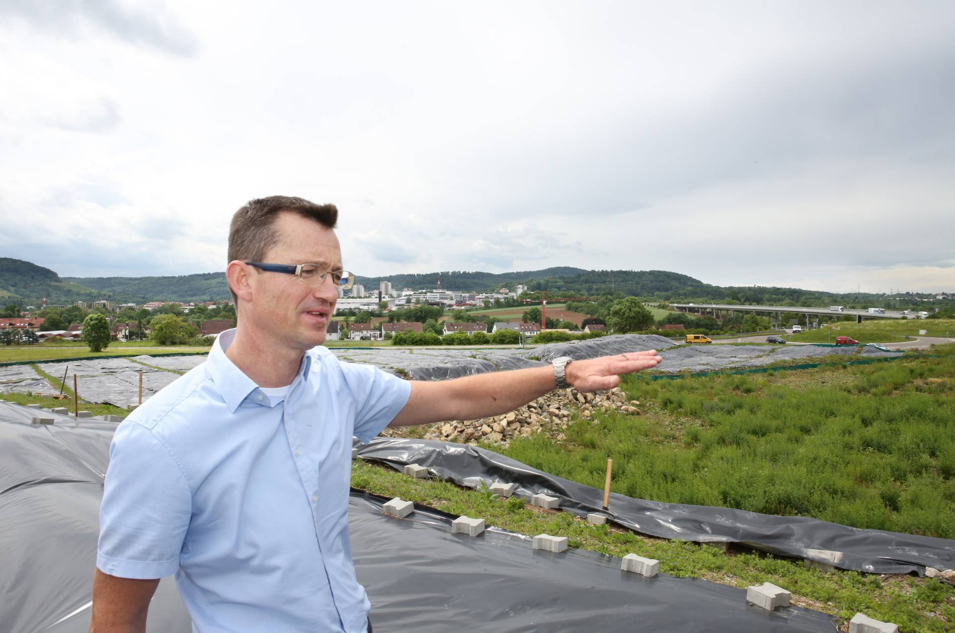 Verseucht war das Gelände also keineswegs, auch wenn hier während der Tunnelbauarbeiten der Abraum gelagert wurde. „Manche dachten auch an Spargelanbau“, erzählt Oliver Graf lachend angesichts des Winds, der am Dienstag die Bahnen hochbläht. Direkt am Ende der Marbacher Straße, vor dem ersten Kreisel, ging das Projekt Anfang April los. Die Biologen stellten kniehohe Zäune aus grünen Planen auf, die später bei der Krötenwanderung woanders ihre Dienste tun können.