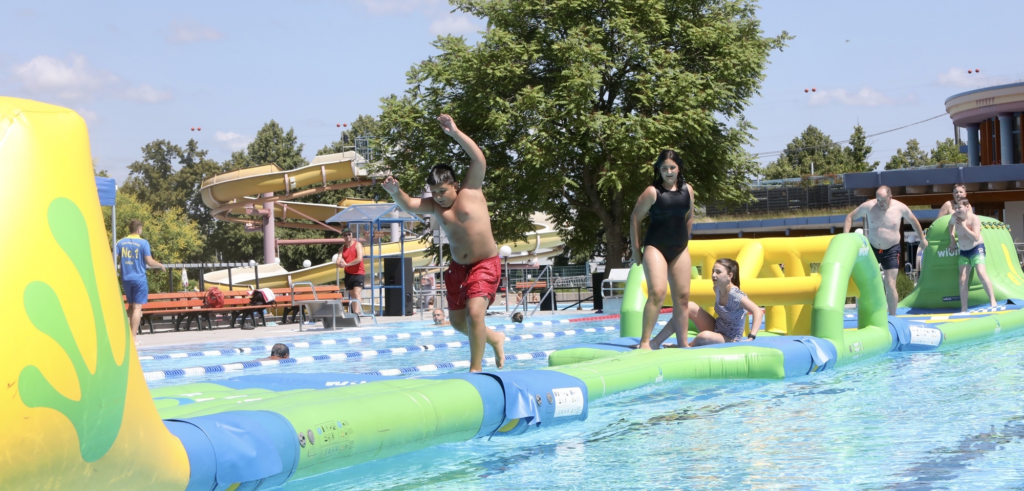 Im 50-Meter-Becken des Wunnebads war am Sonntag nicht nur Bahnenschwimmen angesagt. Am Familien-Action-Tag anlässlich des 30-Jahr-Jubiläums konnten die Kinder versuchen, übers Wasser zu laufen, zu klettern und sich im Sprung über Inseln und Stege zu bewegen.