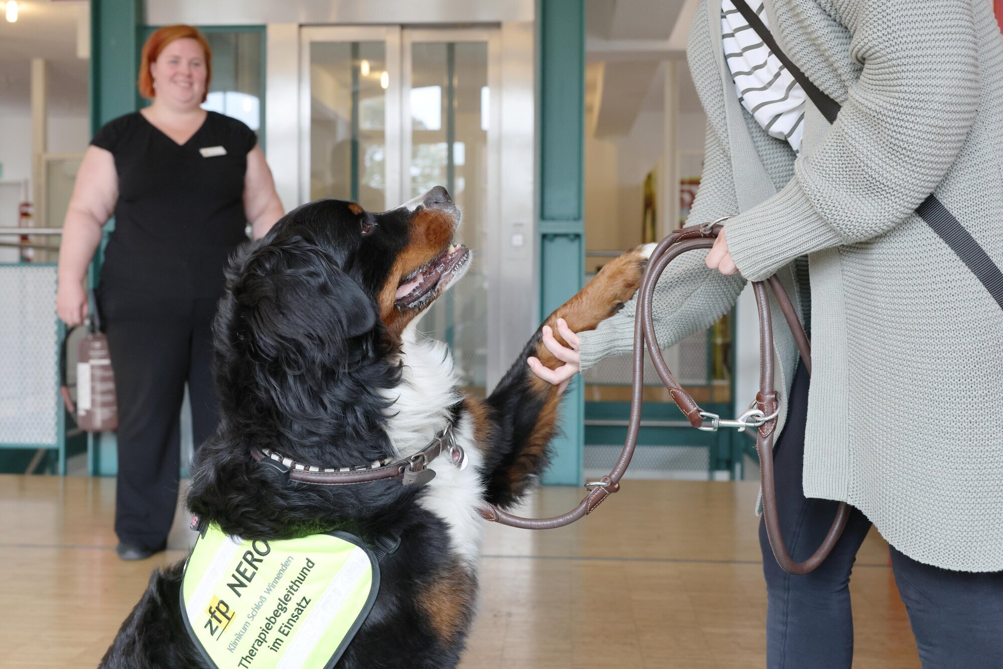Winnenden. Das Zentrum für Psychiatrie (ZfP) hat einen neuen, tierischen Mitarbeiter: Nero. Der überaus beliebte Kollege ist drei Jahre alt, hat weiches Fell und eine kalte Schnauze. Zur Begrüßung reicht er freundlich die Pfote. Seinen Lohn bekommt er in Leckerlis ausbezahlt. Und er wirkt beruhigend auf die Psychiatrie-Patienten. Eine junge Frau berichtet, wie der Hund ihr dabei hilft, Ängste zu überwinden: „Nero vermittelt mir Sicherheit.“