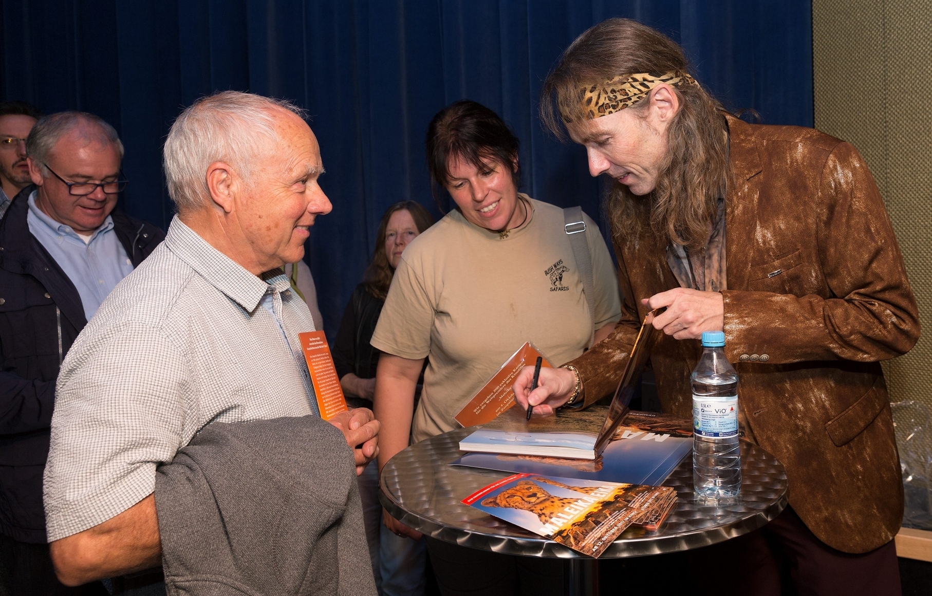 Unter den Kinobesuchern, die sich nach der Filmvorführung ein Buch von Matto Barfuss signieren lassen, sind auch Jessica und Bernd Pohl aus Allmersbach im Tal, die den Gepardenmann vor zehn Jahren zufällig auf einer Safari in Botswana getroffen haben.