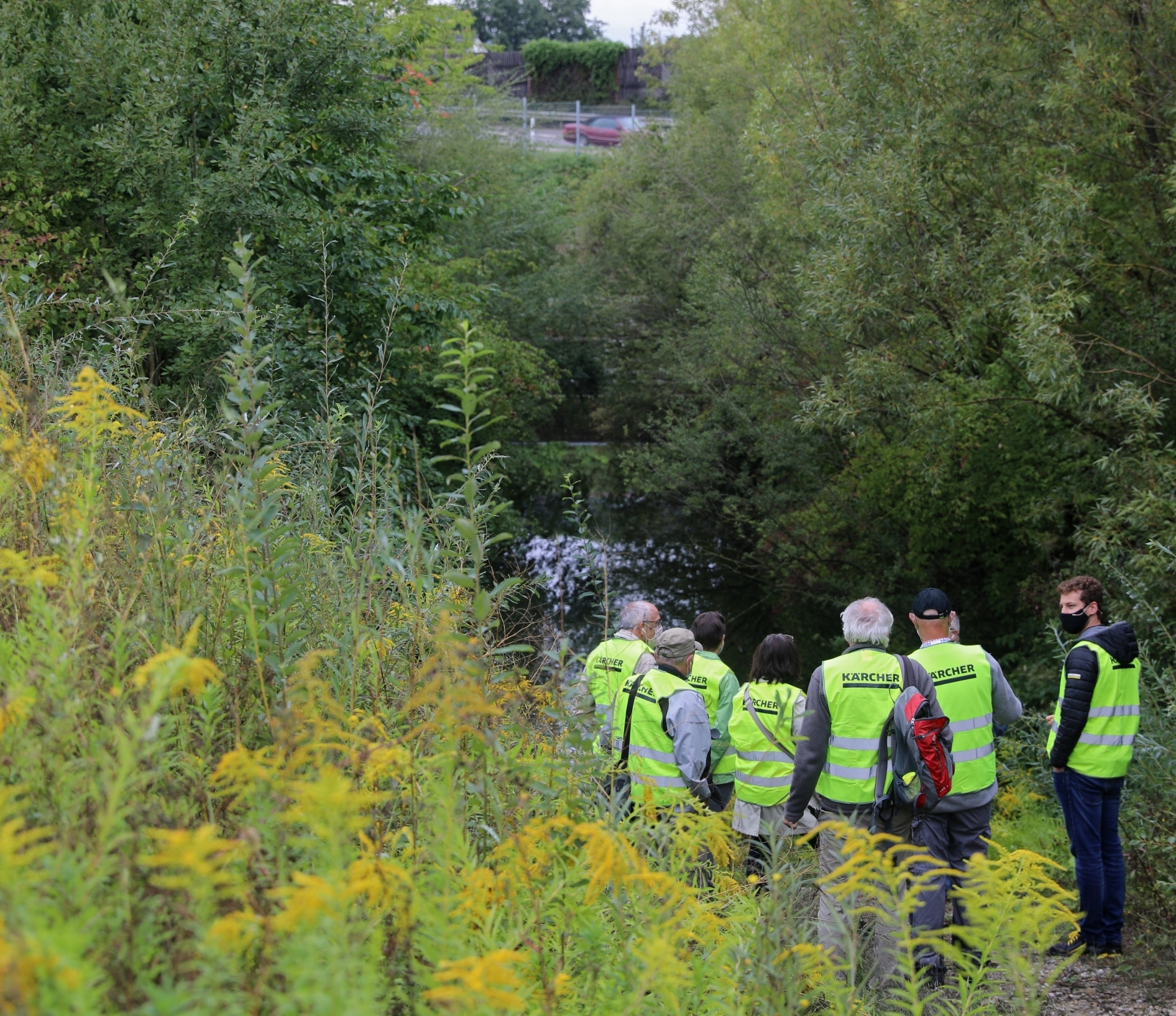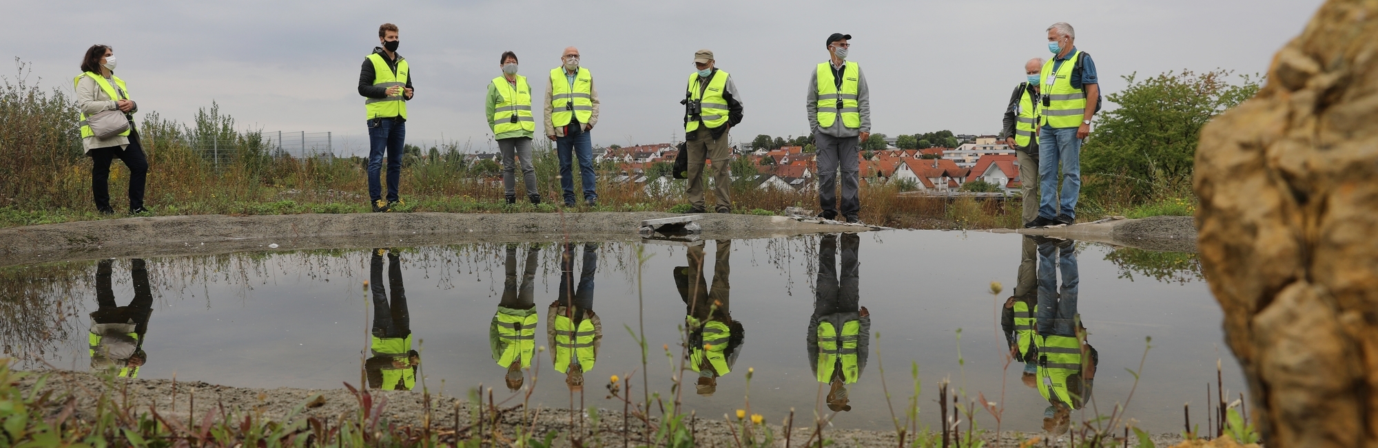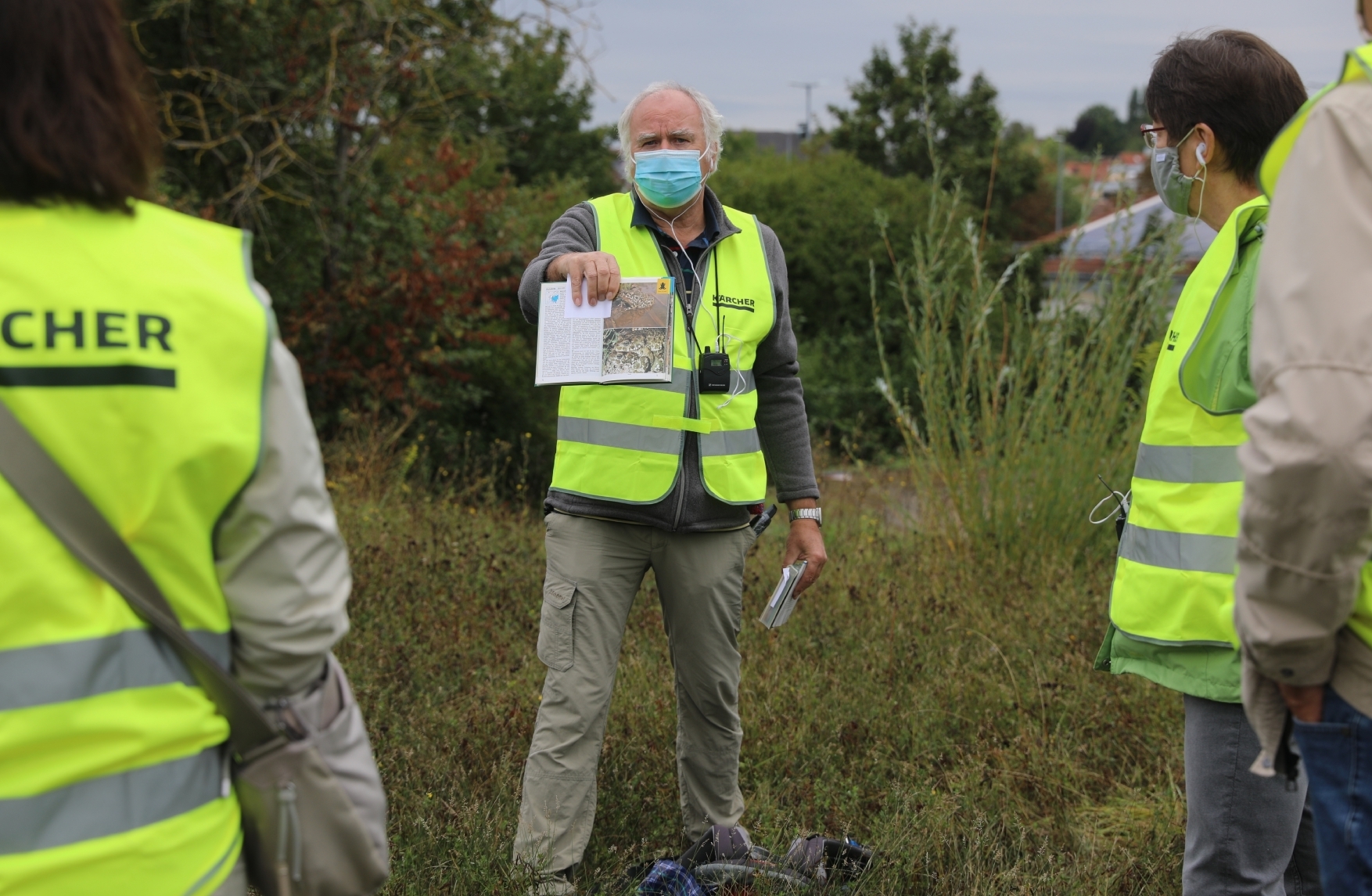 Hinter dem Leutenbacher Aldi beginnt das Kärchergelände. Aufgehäufte Steine und Äste liegen am Wegrand. Ein Stückchen weiter spiegelt sich der graue Himmel in einem Tümpel, Regen tröpfelt in ein Becken. Bei jedem Schritt sinken die Schuhe etwas in den Boden ein. Es ist matschig. Teile des Gebiets sind gemäht, andere nicht. Lässt die Firma Kärcher die Landschaft hier verwahrlosen? „Nein. Genau so soll es sein“, erklärte Denis Tränkle, Fachreferent für Besuchergruppen auf dem Areal des