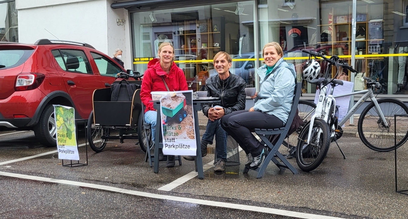 Wer am Freitagvormittag in der Paulinenstraße unterwegs war, dürfte sich über ein ungewöhnliches Parkplatz-Rendevouz gewundert haben. Auf zwei Parkflächen vor dem Modegeschäft „Skurril“ saßen auf Klappstühlen um ein Tischchen herum die beiden Vorsitzenden des Grünen-Ortsverbands Jasmin Gehrke und Daniel Baier, schlürften Kaffee und aßen Kuchen.