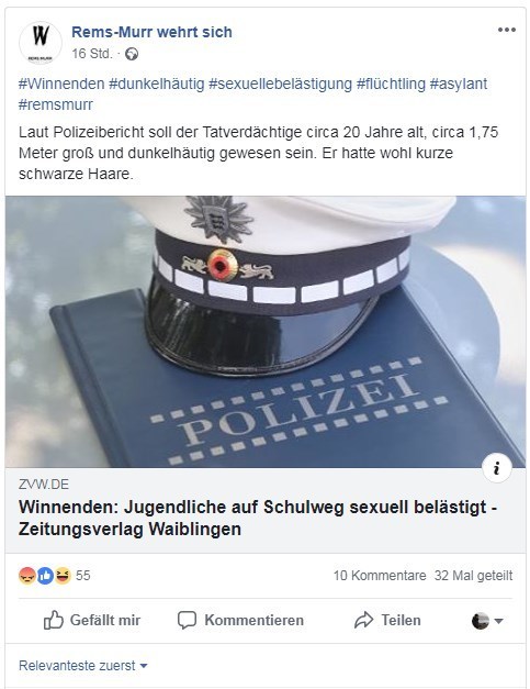 Auf Facebook hat sich schnell das Gerücht verbreitet, es handle sich bei dem Täter um einen Asylbewerber. Verantwortlich dafür ist unter anderem die Facebook-Seite "Rems-Murr wehrt sich". Dort wurde unser Artikel zu dem Vorfall unter Verwendung der Hashtags "#flüchtling" und "#asylant" geteilt. Dabei ist weder im Artikel selbst, noch in der ihm zugrunde liegenden Polizeimeldung etwas über den Aufenthaltstatus des Mannes zu lesen - schließlich handelt es sich um einen Unbekannten.
