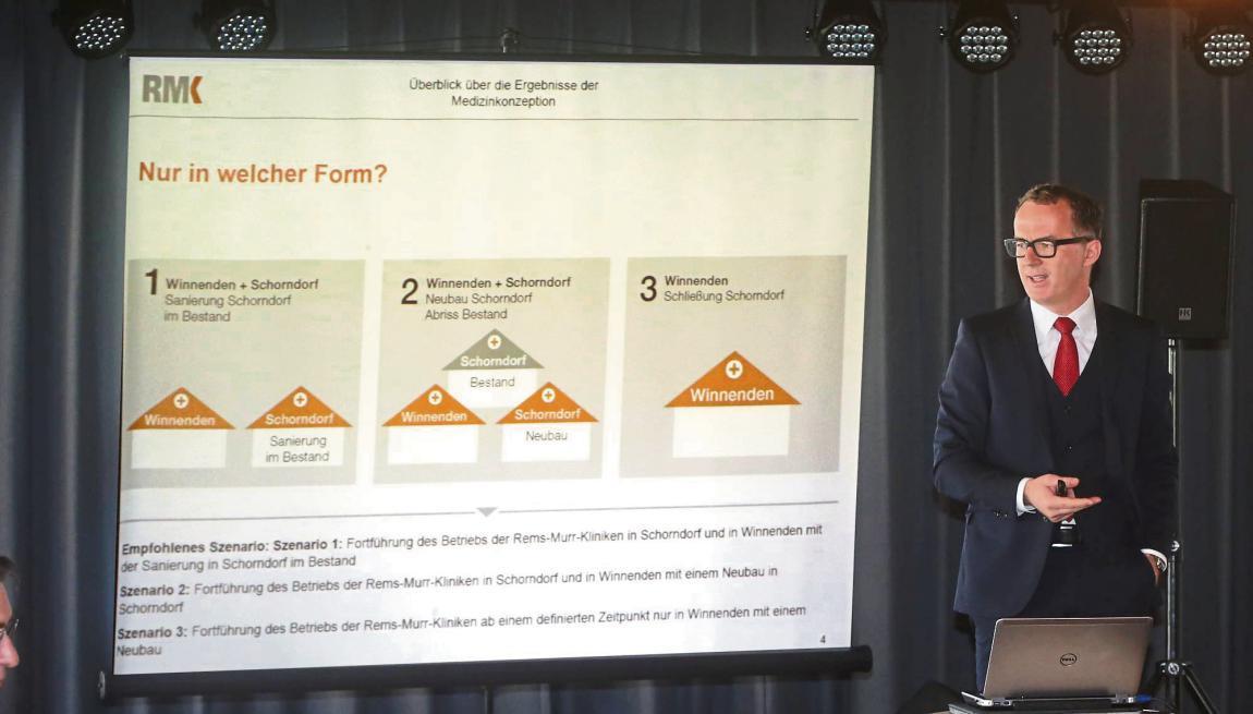 Drei Szenarien werden in der Medizinkonzeption erörtert. Sowohl ein Neubau in Schorndorf wie auch eine Schließung kamen aus medizinischer wie auch aus wirtschaftlicher Sicht nicht infrage. Ein Neubau hätte Investitionen von 230 Millionen Euro inklusive der Erweiterung in Winnenden erfordert; eine Schließung schlage mit 77,5 Millionen Euro zu Buche. Geblieben ist das Szenario 1, bei dem die Kliniken mit Investitionen in Höhe von 69 Millionen Euro kalkulieren: 33 Millionen Euro für die Sanierungen in Schorndorf sowie 35,7 Millionen für den Ausbau in Winnenden – in beiden Rechnungen sind laufende Instandhaltungskosten nicht enthalten.
