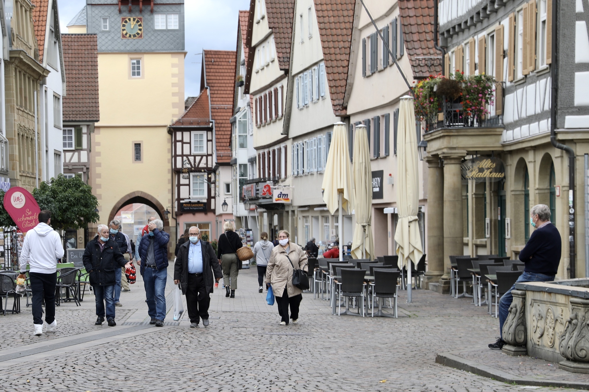 Montagvormittag auf der Winnender Marktstraße. Tag eins im Teil-Lockdown. Die Sonne scheint, das Thermometer zeigt knapp 20 Grad an. Einige Menschen sind unterwegs, manche tragen nicht einmal eine Jacke. Einen Mundschutz haben sie alle auf. Vom sogenannten Teil-Lockdown ist wenig zu spüren. Auf der Bank an der Ecke zur Kirchstraße sitzt ein älterer Mann. Er pfeift fröhlich vor sich her. Vor der Postfiliale schlängeln sich acht Kunden die Marktstraße entlang. Spüren die Einzelhändler schon