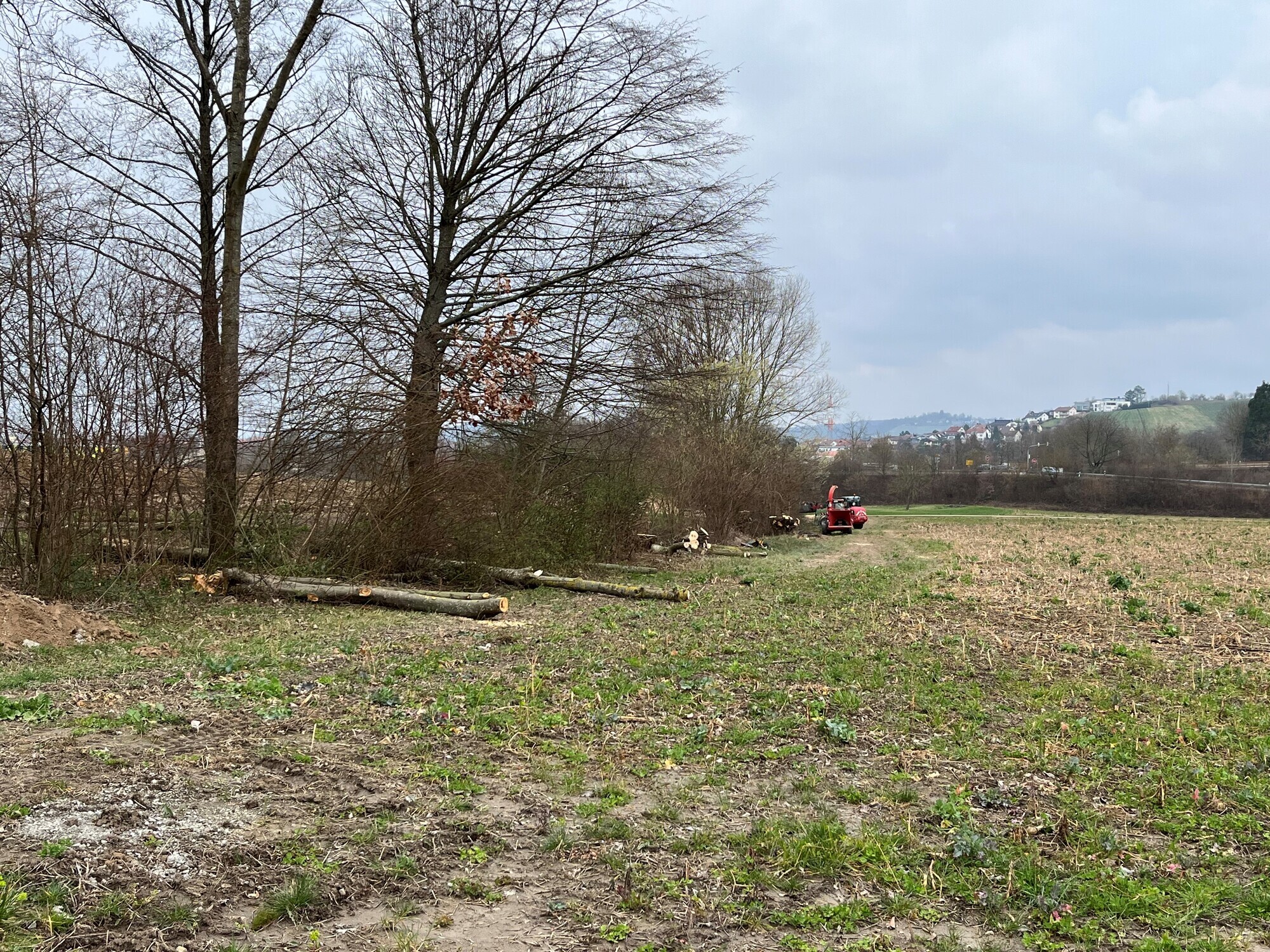 Tatsächlich sind in dieser Woche Arbeiter nahe der Baustelle für die Kita Koppelesbach dort zugange. Stämme liegen vereinzelt auf dem Boden, auch Sägespäne sind zu sehen.