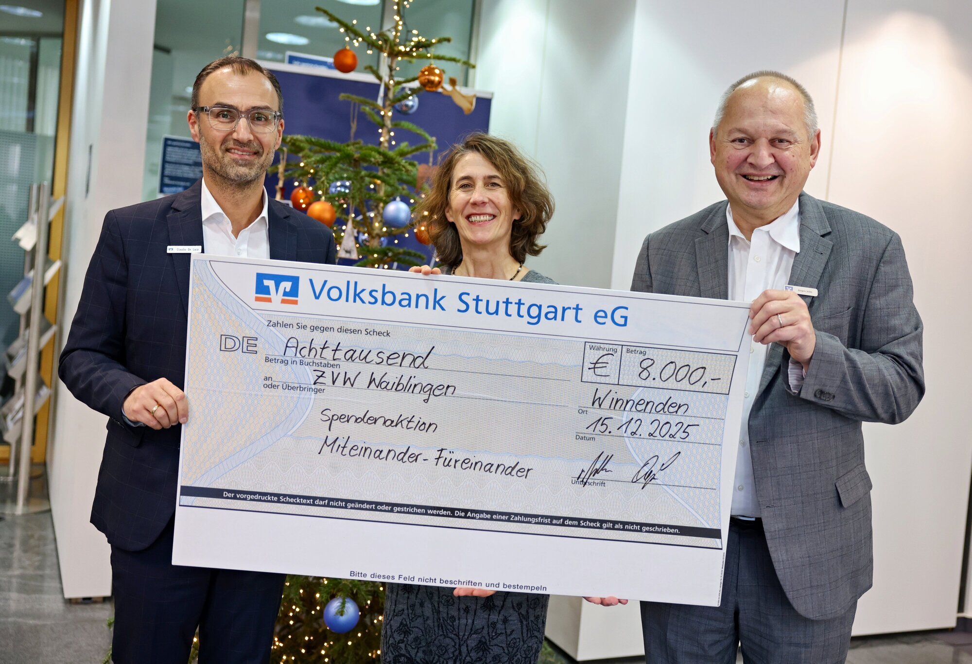 Winnenden. Die Volksbank Stuttgart ist eine der treuesten Spender/-innen für die Aktion „Miteinander - Füreinander“ des Hilfsvereins des Zeitungsverlags Waiblingen. Insgesamt 24.000 Euro schüttet das Geldinstitut heuer aus - 8000 Euro von diesem großen Kuchen durfte per symbolischem Scheck die Lokalredaktion Winnenden in Empfang nehmen.