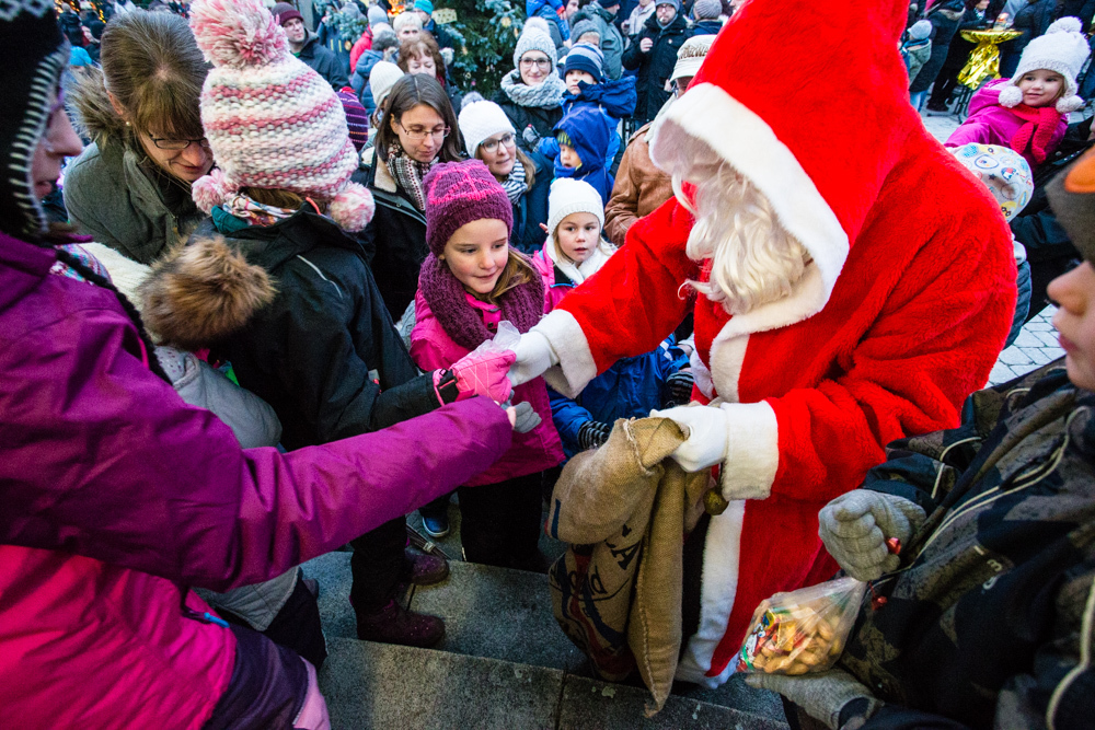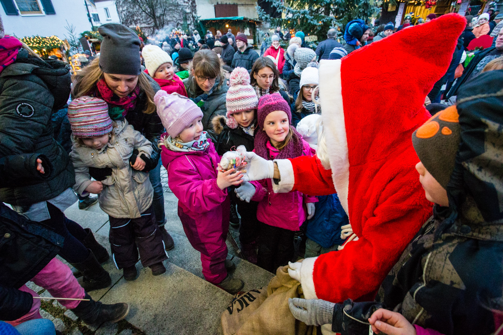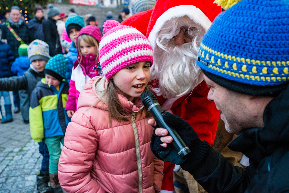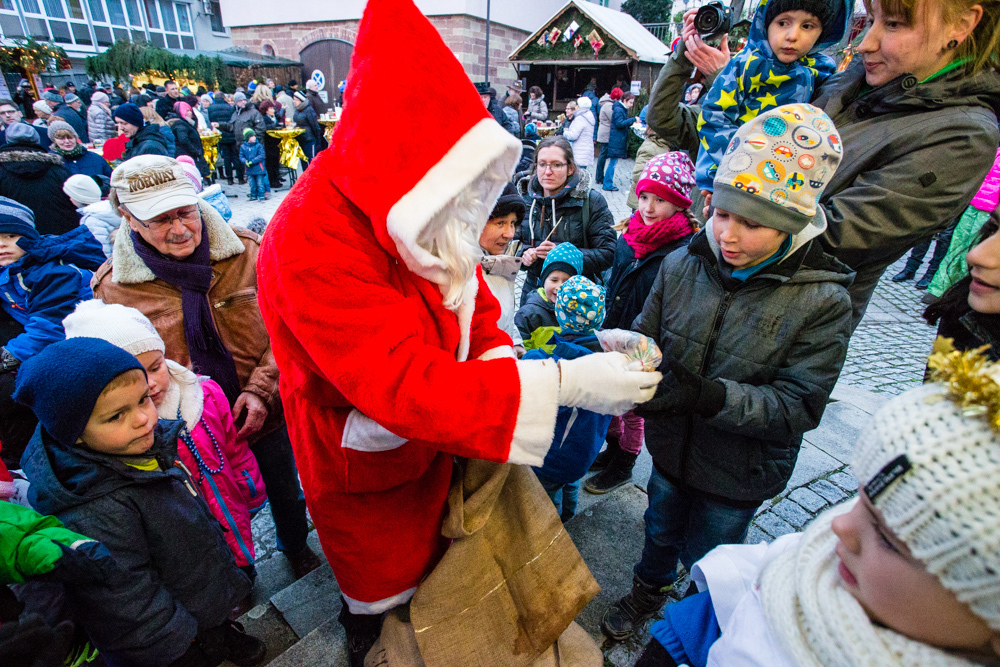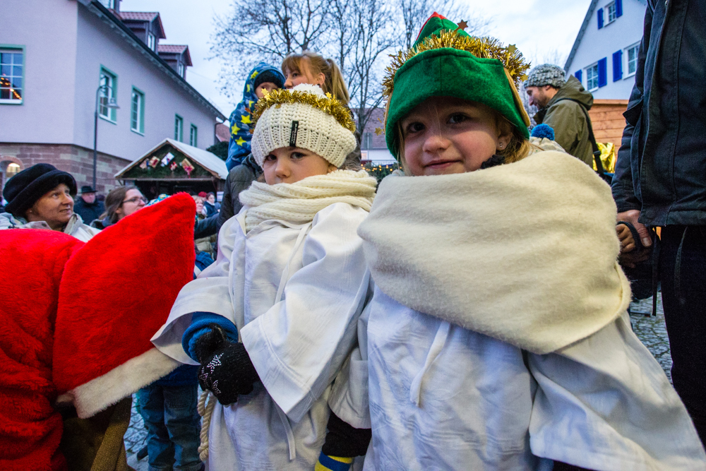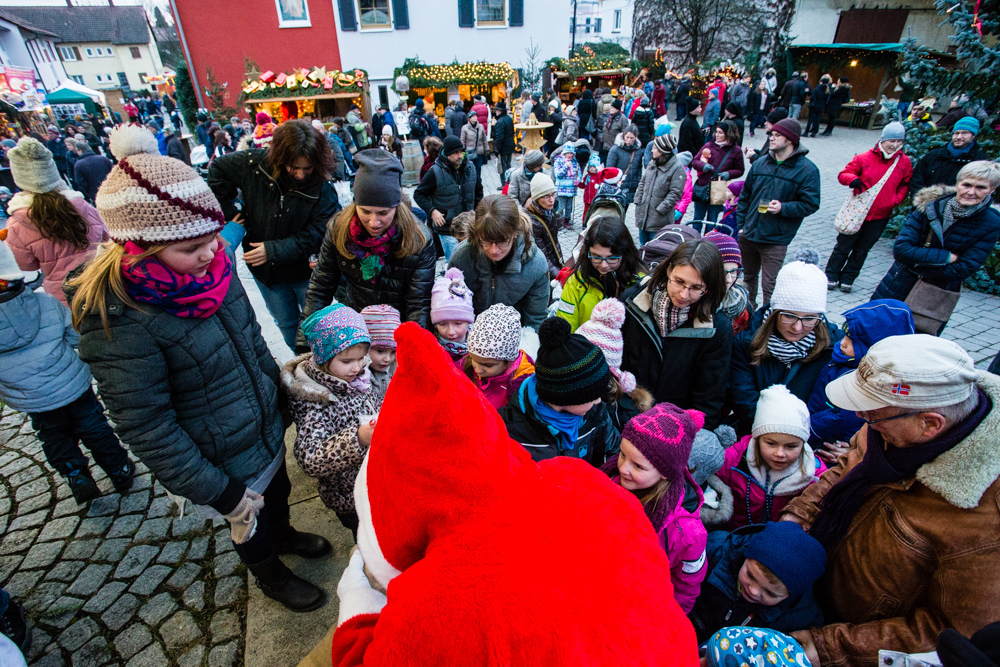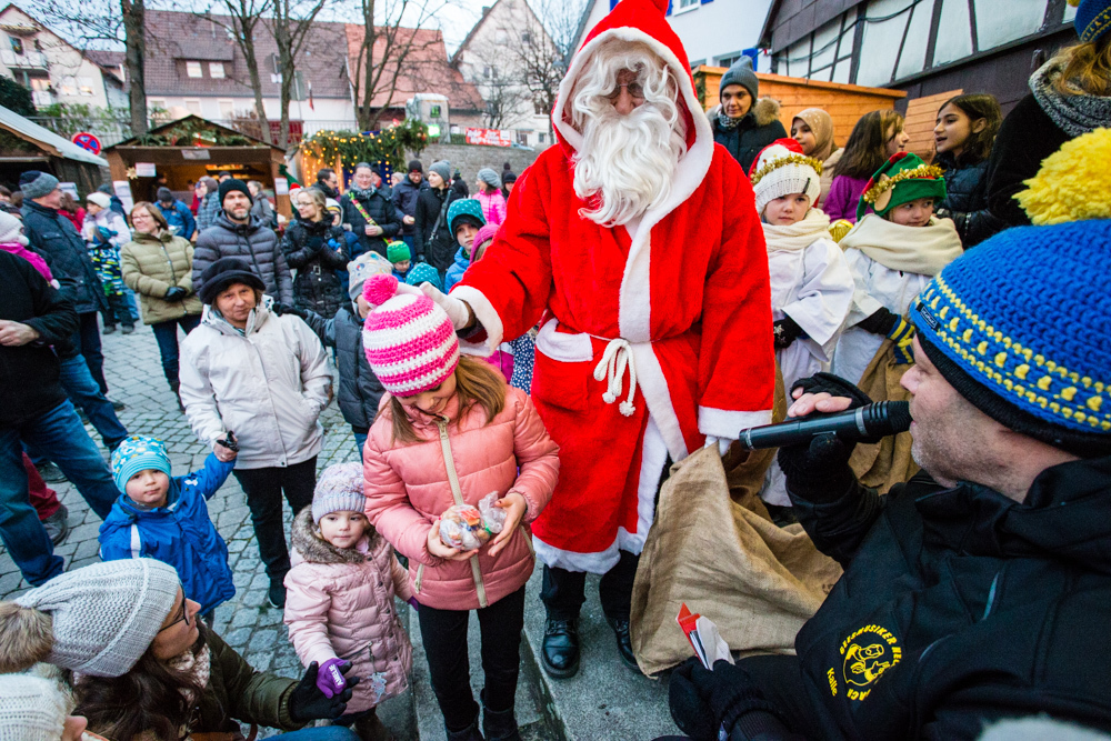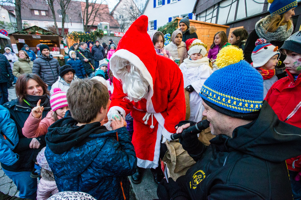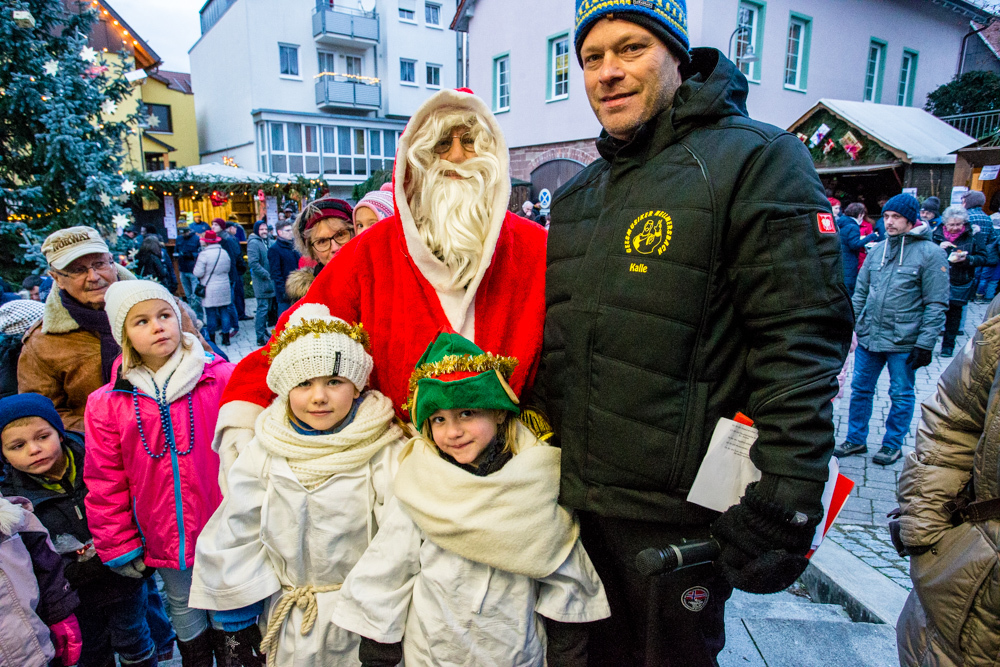 So wie die Moderation von Trompeter Karl-Heinz „Kalle“ Wielsch, der am Samstag die Kids von Kernzeit und Hort „Raupe und Rübchen“ aus Nellmersbach dem Weihnachtsmann vorstellt. Der strenge Rauschebart mit Rute und Sack, der sich auch am Sonntag noch mal sehen lässt, wird ganz handzahm, als ihm der kleine Philipp „In der Weihnachtsbäckerei“ vorsingt, und rückt zum Dank ein Gutsle-Säckchen raus. So wie auch den anderen Kindern, die sich trauen, ein paar Verse von „Alle Jahre wieder“ oder anderen Adventsklassikern mehr aufzusagen als zu singen. „Trauen sich auch Erwachsene?“, fragt Wielsch in die Runde, worauf eine allgemeine Flucht einsetzt.