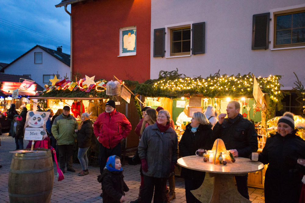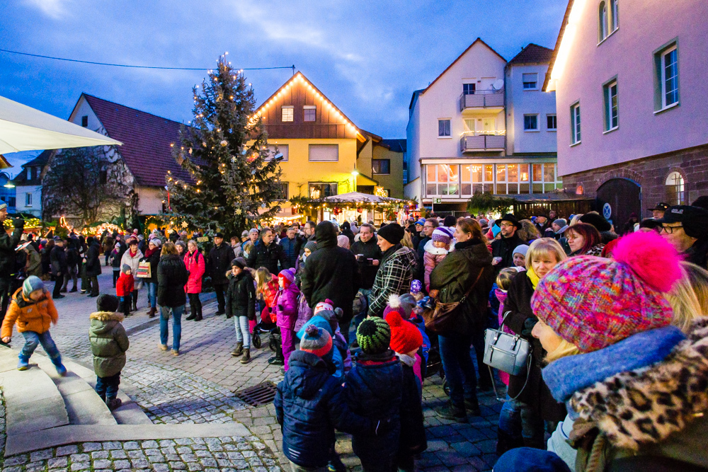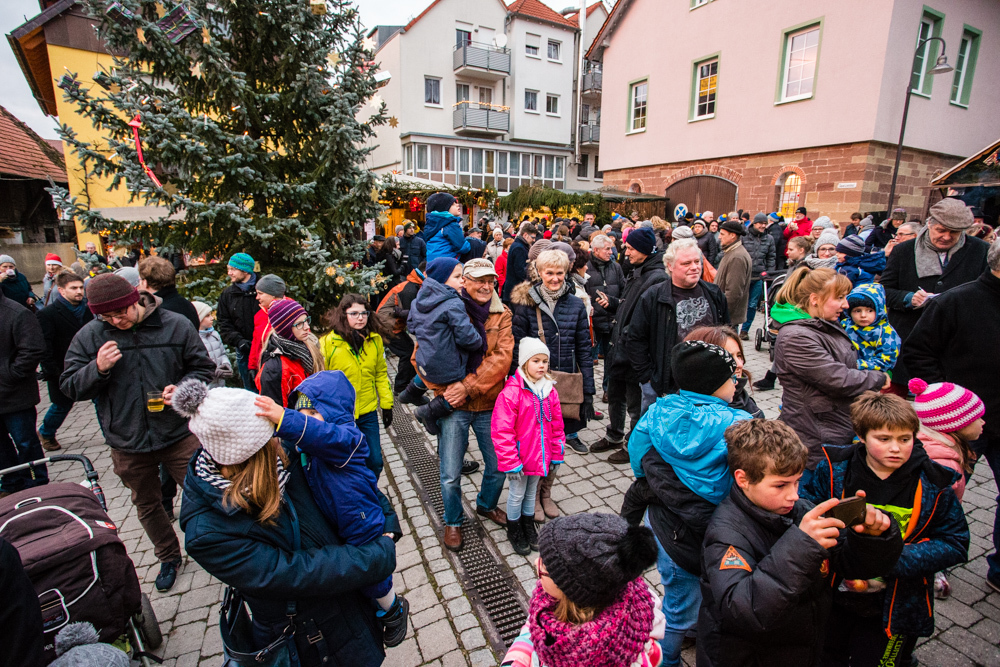 Auch dies eine Leutenbacher Weihnachtsmarkt-Spezialität: ein umfangreiches Begleitprogramm, neben den Geesmusikern noch mit dem Musikverein und seinen diversen Ensembles, dem Männergesangverein, dem Posaunenchor, den Jagdhornbläsern der Jagdfreunde.