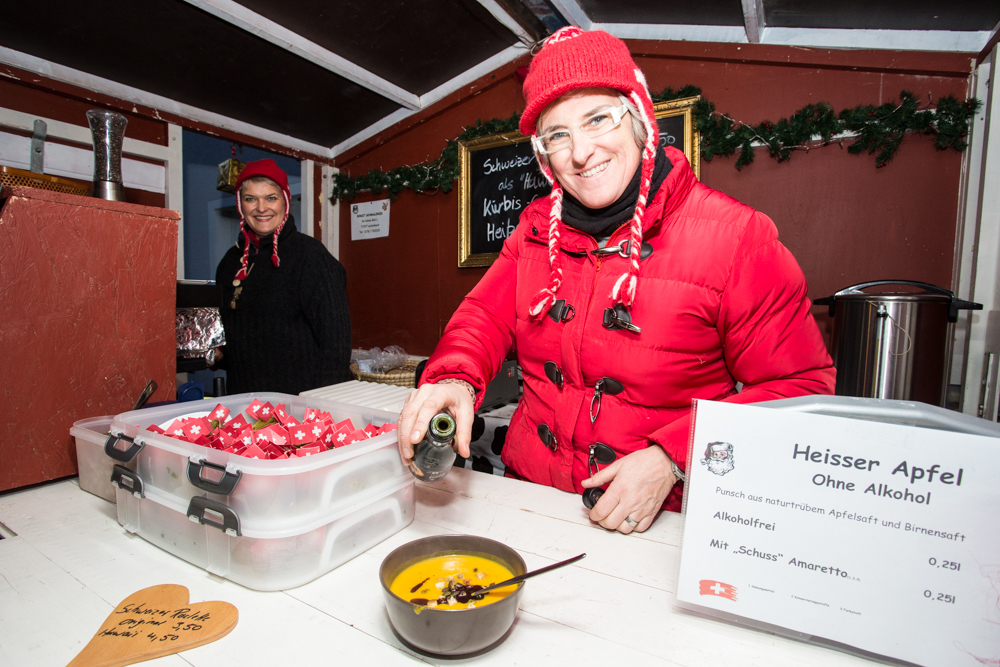 Auch der starke Geruch nach Raclette und Käse, durchmischt von dampfender Kürbissuppe, beim Stand von Birgit Schmalzried erweitert das übliche Advents-Angebot um neue Facetten. Ebenso die Gäste aus Dunabogdany, von Jürgen Kiesl auf Ungarisch begrüßt.