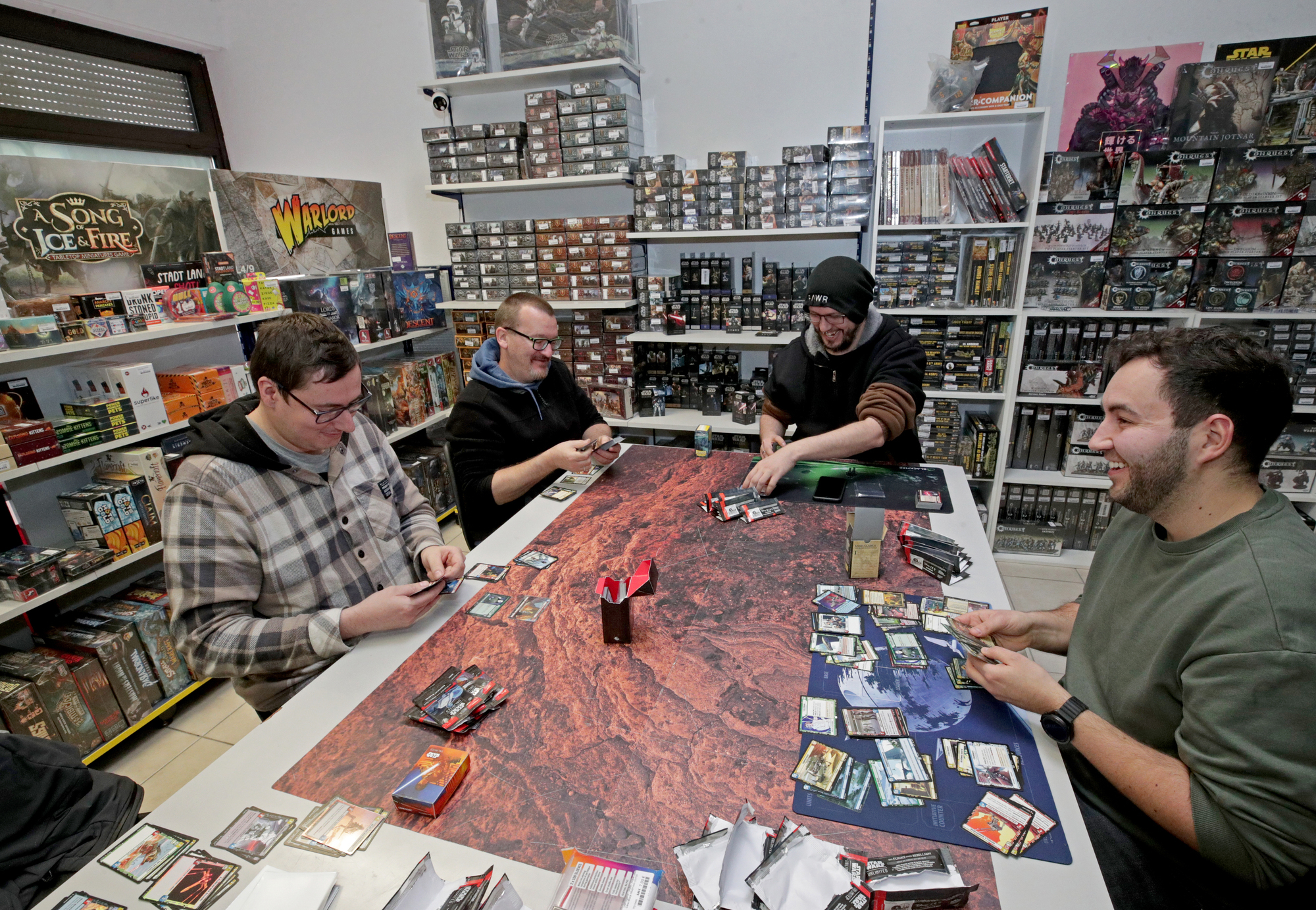 „Ich habe ihn: Vader“, freut sich Daniel Kicherer. Der 35-Jährige aus Weinstadt hat gerade im Trading Goblin Gamesworld in Winnenden seinen sechsten Booster von Star Wars Unlimited ausgepackt und die Kartenmotive gesichtet. Während seine Mitspieler seufzen, „Rauch und Asche“ murmeln oder rhetorisch fragen, ob sie die 16er-Kartenpäckchen umtauschen können (nein, nur mit anderen tauschen), erläutert Spielleiter Marcel Schneidenbach (37), dass Daniel einen Glückstreffer gelandet hat: „Die Karte