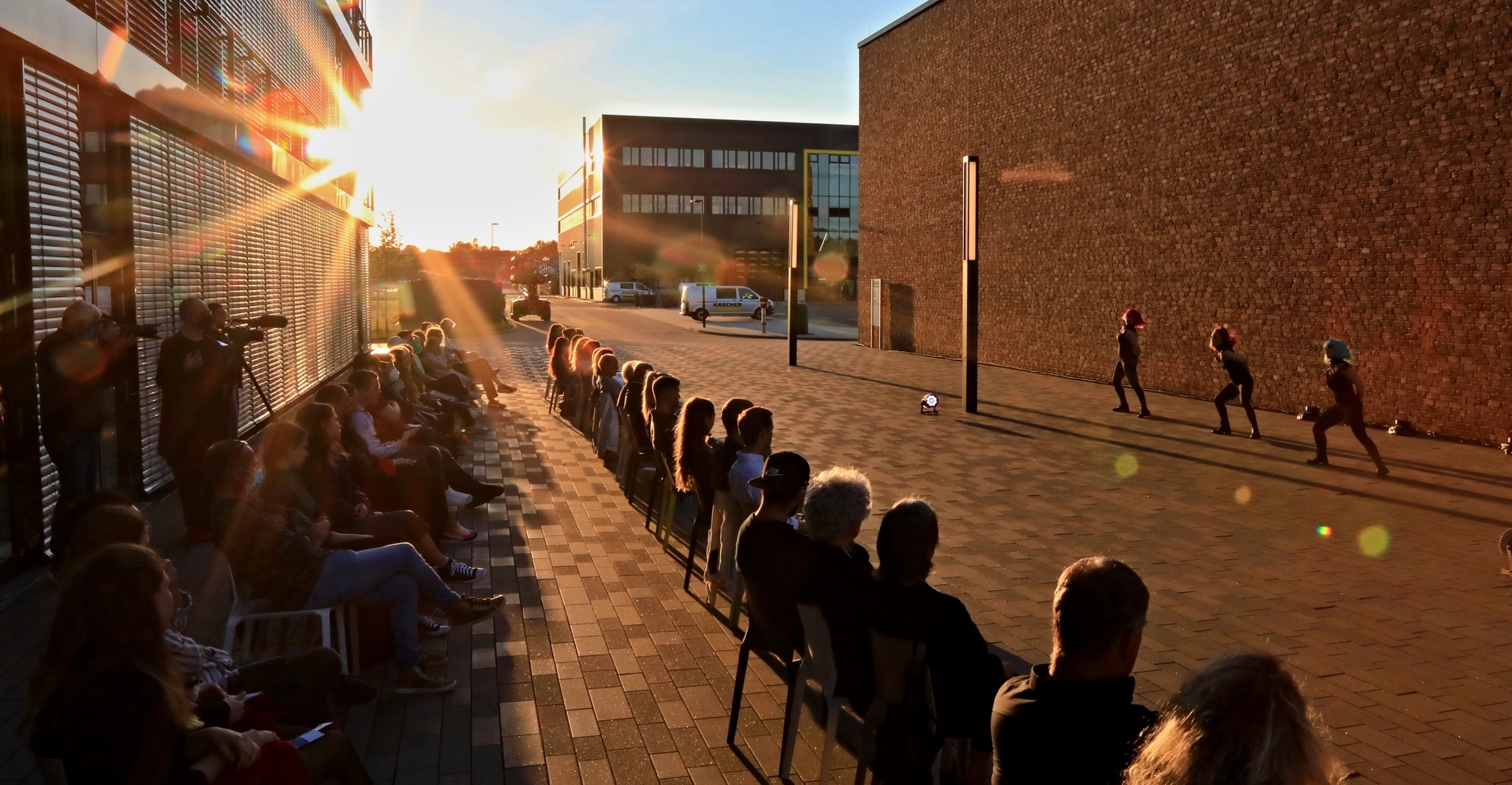 Geahnt haben wir es schon lange: Der Platz vor dem Kärcher-Auditorium ist wie eine Bühne mit seinen überdimensionalen, gelben Mohnblumen, seiner Retro-Backsteinmauer, dem Aufgang zur Brücke über die Schienen und den kleinen Fontänen neben dem Auditorium.