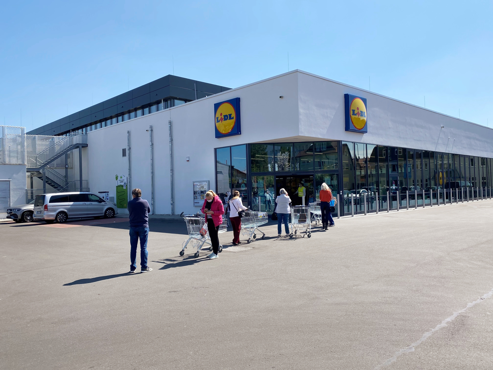 Vor der Lidl-Filiale an der Waiblinger Straße bildet sich am Montag um kurz vor 12 Uhr eine Schlange von zeitweise bis zu zehn Personen. Mit ihren Einkaufswagen warten sie auf Einlass. Ein Security-Mann mit neongelber Warnweste steht an der Tür. Darf ein Kunde den Laden betreten, muss ihn zuvor jemand anderes verlassen. Freundlich winkt er die Ersten in der Schlange in die Lidl-Filiale.