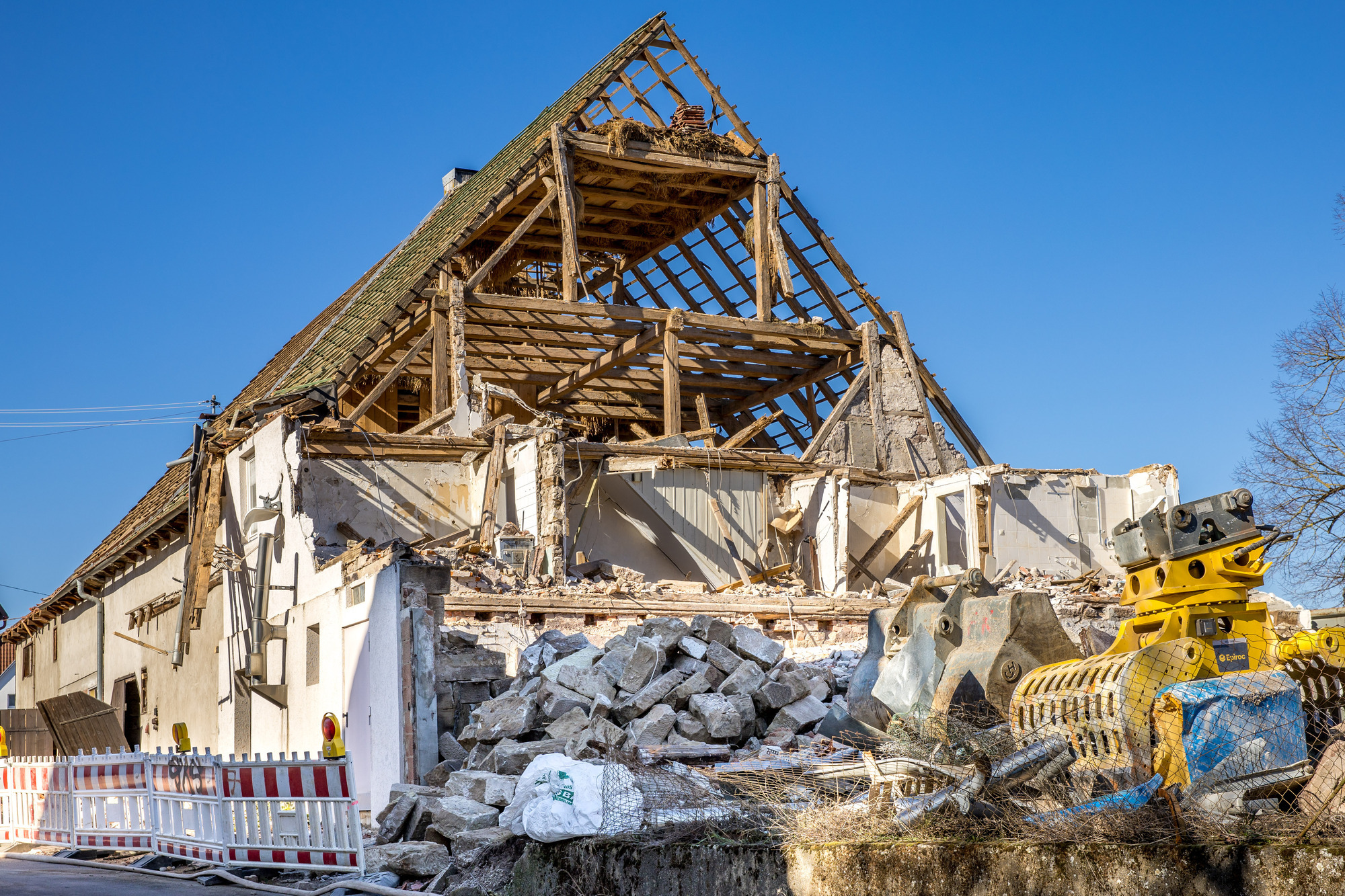 Winnenden. An geschichtsträchtiger Stelle im Weiler Degenhof, der zu Winnenden-Hertmannsweiler gehört, sollen drei Einfamilienhäuser entstehen (wir haben berichtet). Der Abbruch eines historischen Gebäudeensembles hat jetzt begonnen. Zum Wochenbeginn bissen sich Bagger in die Bausubstanz, stürzten Mauersteine und Dachziegel krachend zu Boden, legten die Arbeiter der Abrissfirma mit ihrem schweren Gerät den Blick auf die hölzernen Dachbalken frei.
