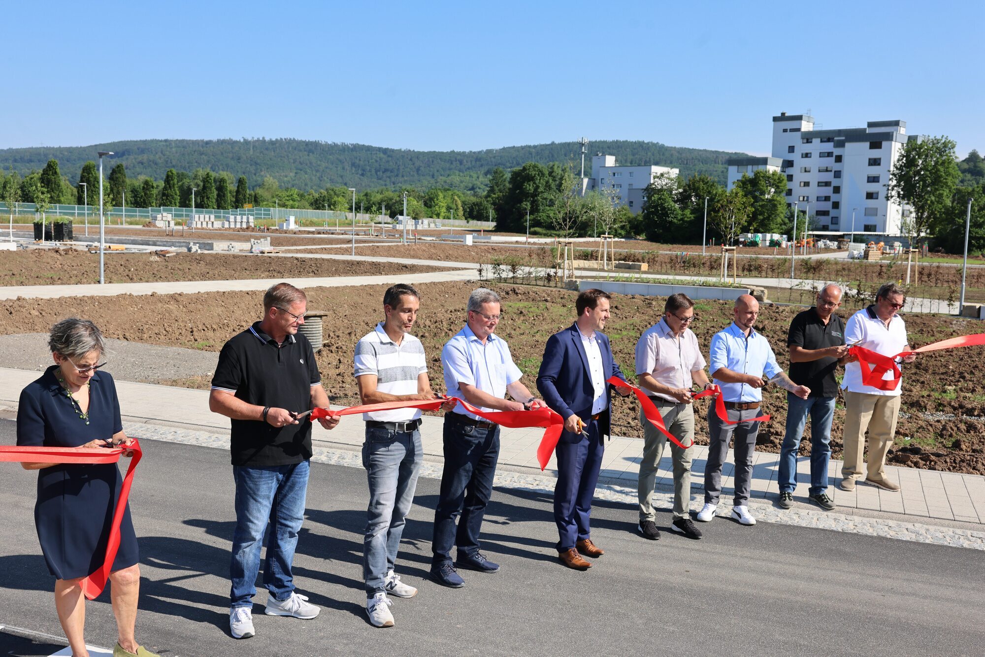 Gemeinderäte, Planer, Vertreter der Baufirmen und der Bürgermeister zerschnitten ein rotes Band zur Freigabe des Baugebiets. © Gabriel Habermann